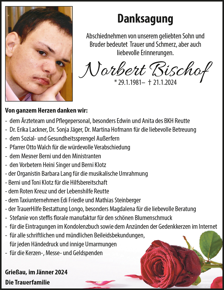So wie Sie, Frau Bischof, Norbert sein ganzes Leben lang umhegt und fürsorglich begleitet haben, mögen Engel nun euren lieben Norbert begleiten. Sie haben so Unglaubliches für Ihr Kind geleistet!