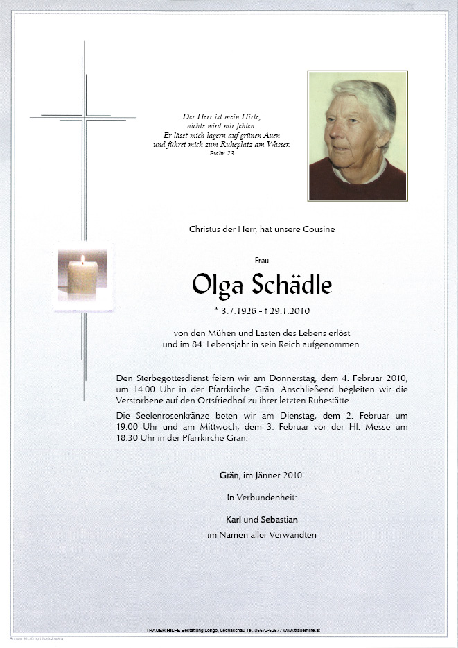 13.12.1901 29.01.2010 Grän Olga Schädle Action Parte Sterbebild Gedenkkerzen Kondolenzen Parte Sterbebild Gedenkkerzen Kondolenzen Parte herunterladen Sterbebild herunterladen Gedenkkerzen für Olga Schädle 1 Eintrag Kerze anzünden a Liachtle für di Ihre Gedenkkerze fürOlga Schädle Ihr Name* Farbe auswählen Ihre Nachricht oder Name* E-Mail-Adresse* Mit dem Klicken auf "Kerze anzünden" erklären Sie sich mit unseren Datenschutzbestimmungen einverstanden. Kondolenzbuch für Olga Schädle 0 Einträge Kondolenz verfassen Ihr Abschiedsgruß an Olga Schädle Ihr Name* E-Mail-Adresse* Ihre Nachricht* Mit dem Klicken auf "Gruß absenden" erklären Sie sich mit unseren Datenschutzbestimmungen einverstanden.