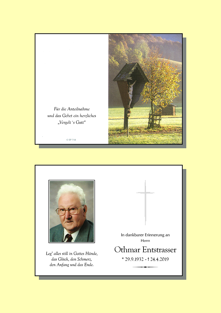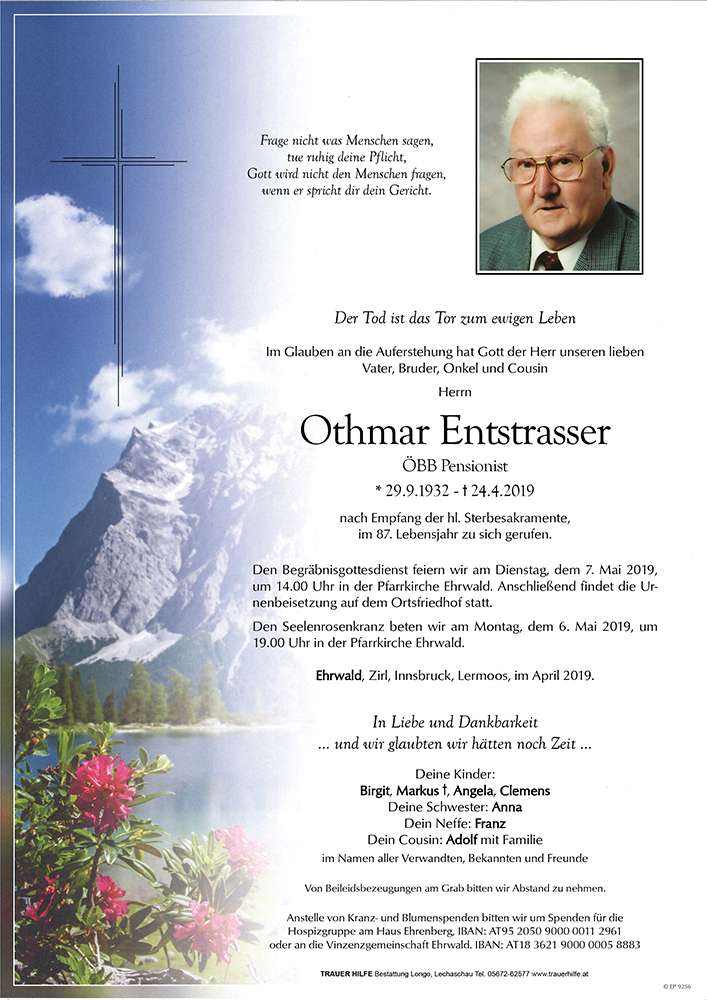 Liebe Trauerfamilie, lieber Othmar, ich weiß, Deine geliebte Paula hat Dich empfangen. Nie werde ich vergessen, wie Du damals - ich war Schüler im Gymnasium - und fuhr viel mit dem Zug. Du hast mich immer mitgenommen, oft, wenn es zeitlich ging, mich sogar zum Kirchplatz gefahren. Oft traf ich Euch im Moos. Und jetzt, viel viel später , kamst Du als Gast zum Eisholen. Ach Othmar, ich weiß, es geht Dir jetzt gut. Herzlichst, Erich Papp
