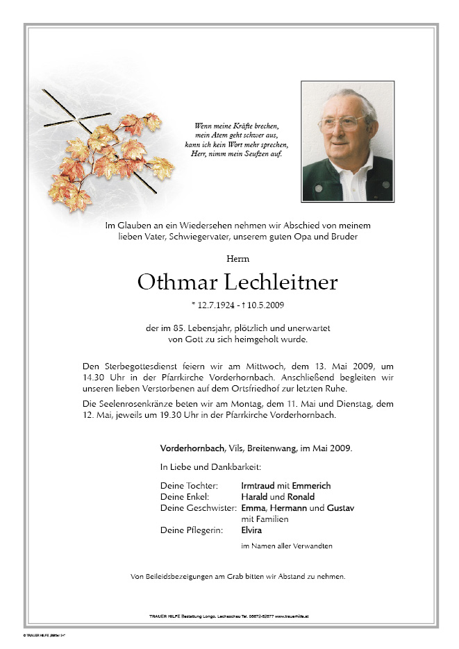 13.12.1901 10.05.2009 Vorderhornbach Othmar Lechleitner Action Parte Gedenkkerzen Kondolenzen Parte Gedenkkerzen Kondolenzen Parte herunterladen Gedenkkerzen für Othmar Lechleitner 1 Eintrag Kerze anzünden für dich Ihre Gedenkkerze fürOthmar Lechleitner Ihr Name* Farbe auswählen Ihre Nachricht oder Name* E-Mail-Adresse* Mit dem Klicken auf "Kerze anzünden" erklären Sie sich mit unseren Datenschutzbestimmungen einverstanden. Kondolenzbuch für Othmar Lechleitner 0 Einträge Kondolenz verfassen Ihr Abschiedsgruß an Othmar Lechleitner Ihr Name* E-Mail-Adresse* Ihre Nachricht* Mit dem Klicken auf "Gruß absenden" erklären Sie sich mit unseren Datenschutzbestimmungen einverstanden.