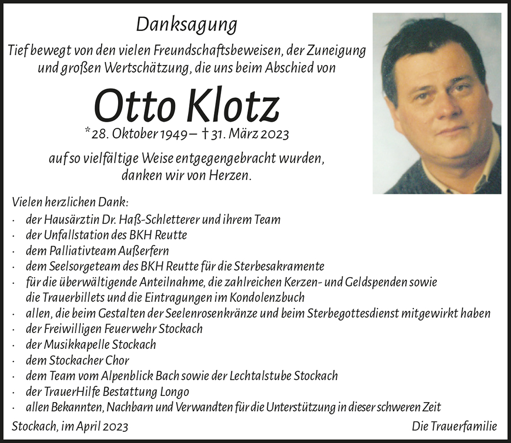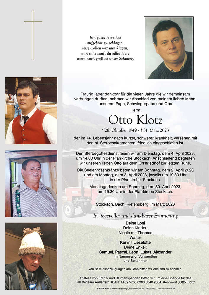 Liebe Fam. Klotz Was der Vater Opa und Schwiegervater für euch gewesen, steht im Grabstein nicht zu lesen. Tief eingemeiselt wie aus Erz, steht es in eurem Herz. Ruhe in Frieden lieber Otto.