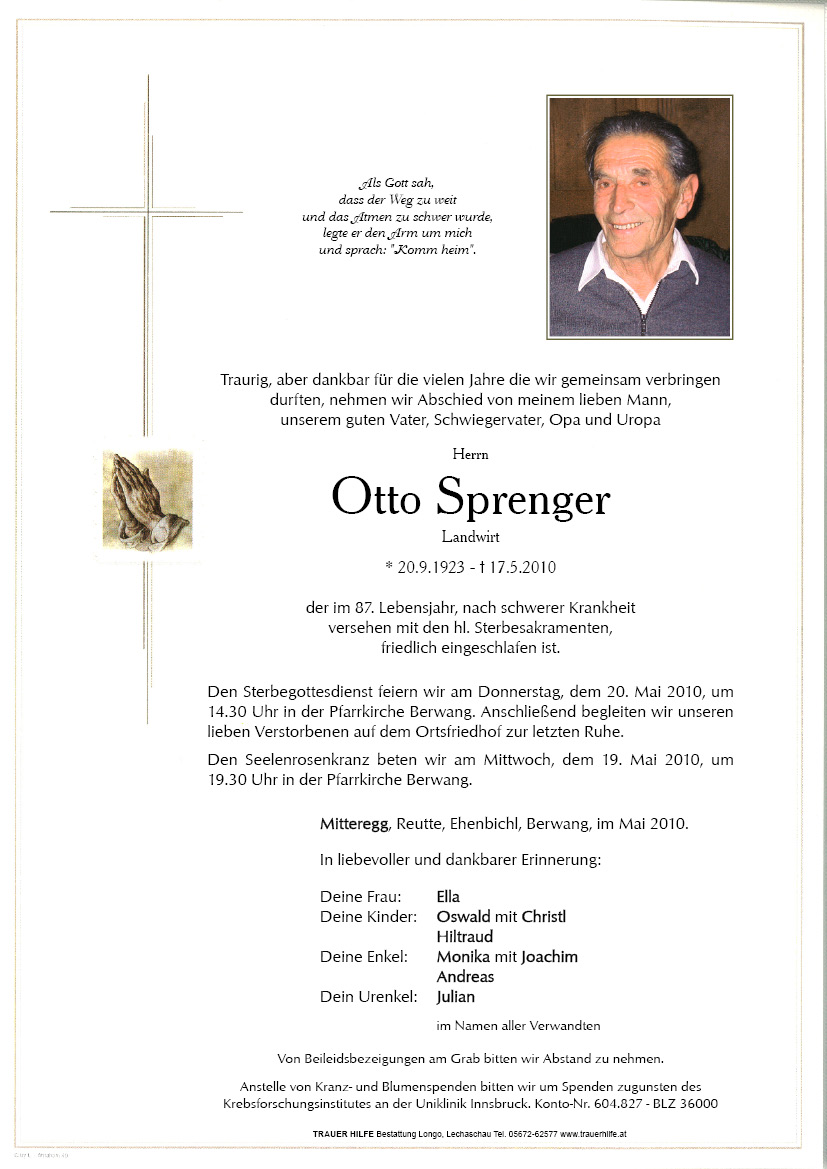 13.12.1901 17.05.2010 Mitteregg Otto Sprenger Action Parte Sterbebild Gedenkkerzen Kondolenzen Parte Sterbebild Gedenkkerzen Kondolenzen Parte herunterladen Sterbebild herunterladen Gedenkkerzen für Otto Sprenger 0 Einträge Kerze anzünden Ihre Gedenkkerze fürOtto Sprenger Ihr Name* Farbe auswählen Ihre Nachricht oder Name* E-Mail-Adresse* Mit dem Klicken auf "Kerze anzünden" erklären Sie sich mit unseren Datenschutzbestimmungen einverstanden. Kondolenzbuch für Otto Sprenger 0 Einträge Kondolenz verfassen Ihr Abschiedsgruß an Otto Sprenger Ihr Name* E-Mail-Adresse* Ihre Nachricht* Mit dem Klicken auf "Gruß absenden" erklären Sie sich mit unseren Datenschutzbestimmungen einverstanden.