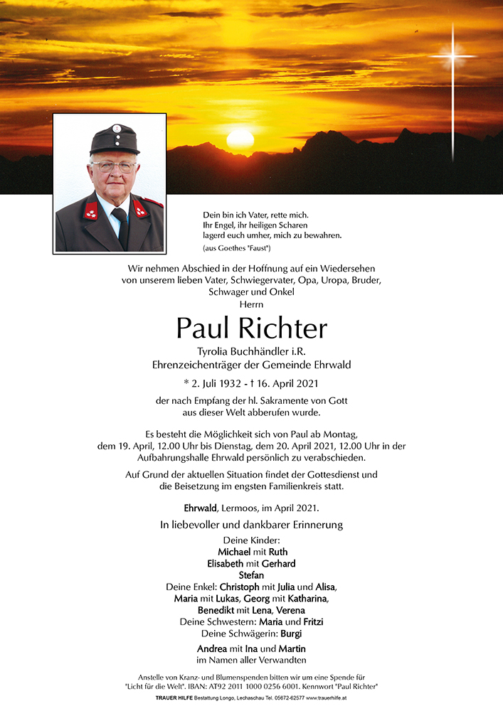 Paul hat seine Spuren in unserem Dorf hinterlassen, dafür sind wir ihm dankbar.Er konnte im Kreis seiner Familie die letzten Tage verbringen und jetzt ist er dort, wo ihn sein Glaube hingetragen hat.