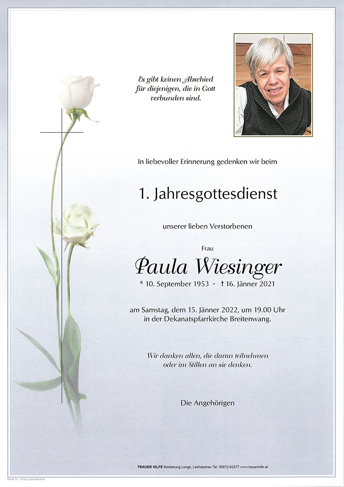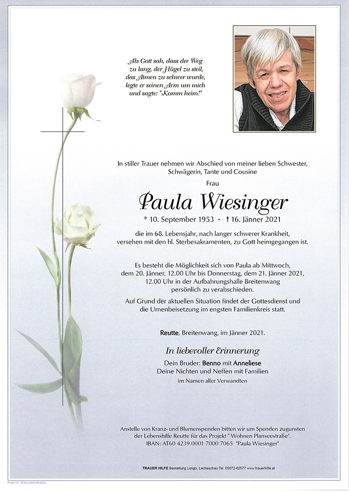 in tiefer Betroffenheit haben wir vom Ableben unserer Klientin Paula Wiesinger erfahren.
