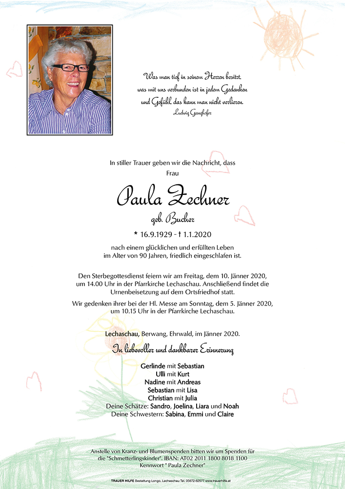 Wenn ein langes erfülltes Leben zu Ende geht, und der Schmerz auch so groß ist, den wir ertragen, so mag es uns doch ein Trost sein, dass wir einen geliebten Menschen so lange bei uns haben durften.