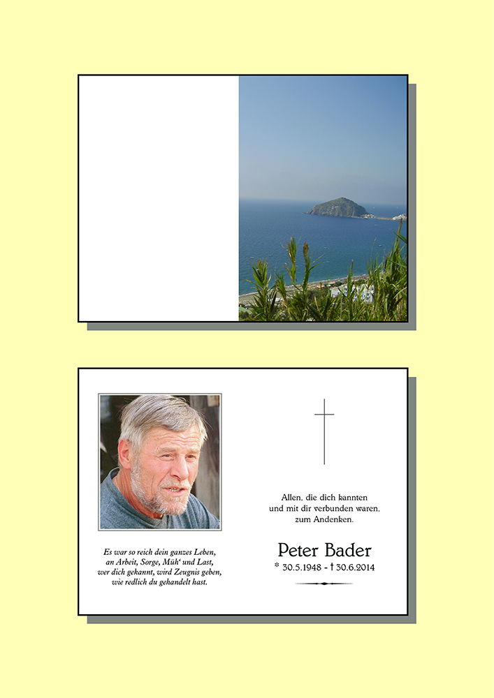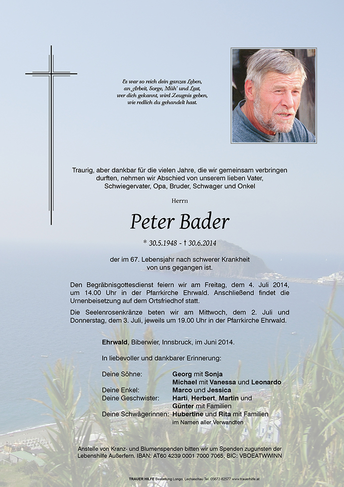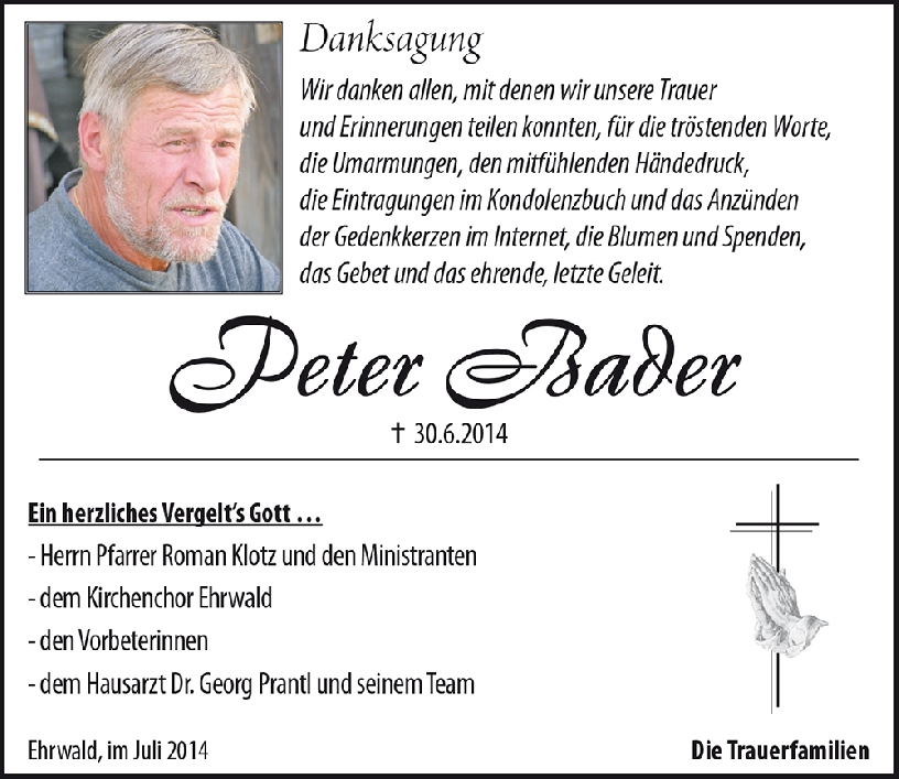 Das Leiden ist beendet.Der liebe Gott hat ihn erlöst und ihn zu Annelies geholt. Wir werden Peter in lieber Erinnerung behalten. Für euch alles Gute und viel Kraft und Stärke. Es trauern mit euch