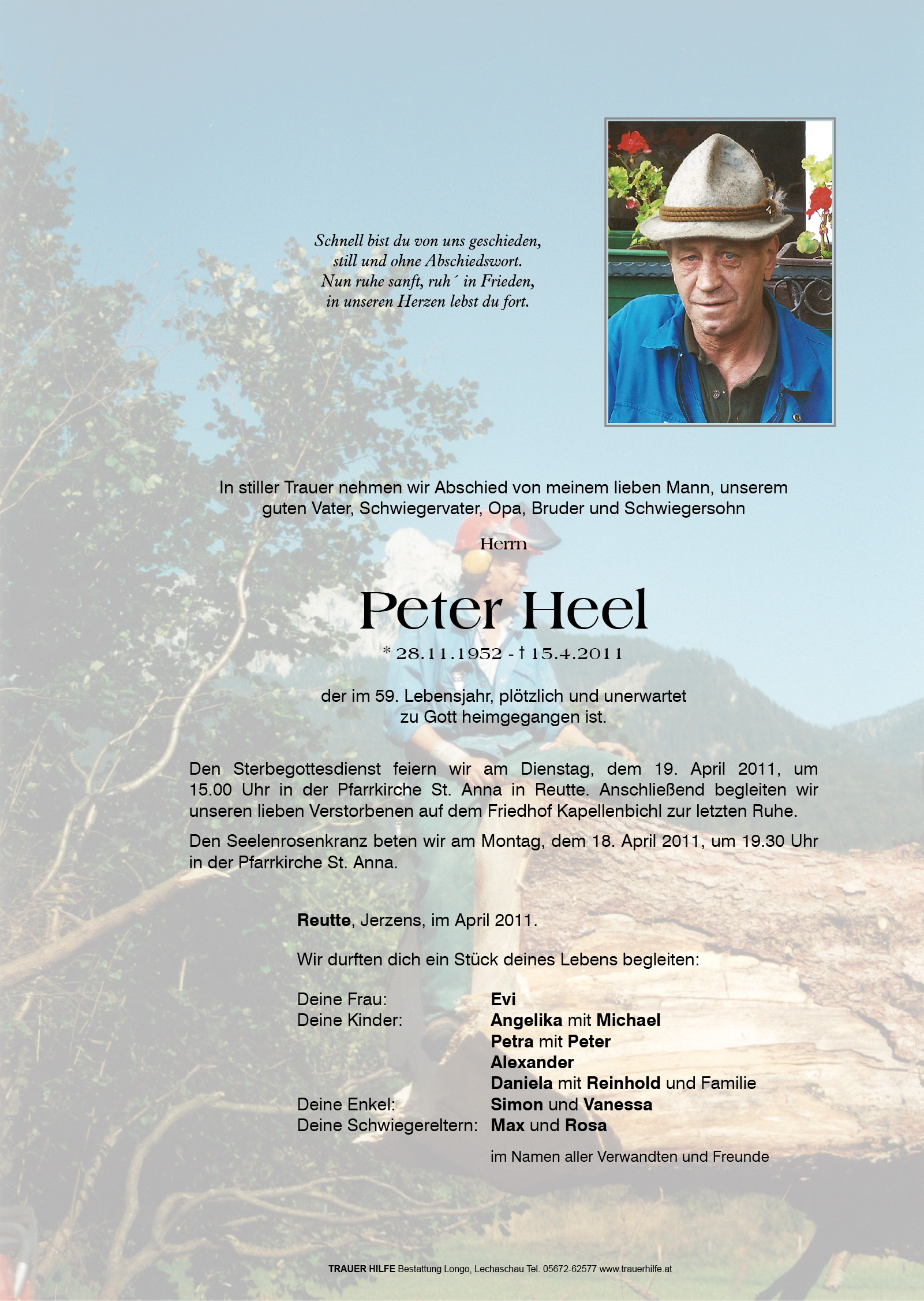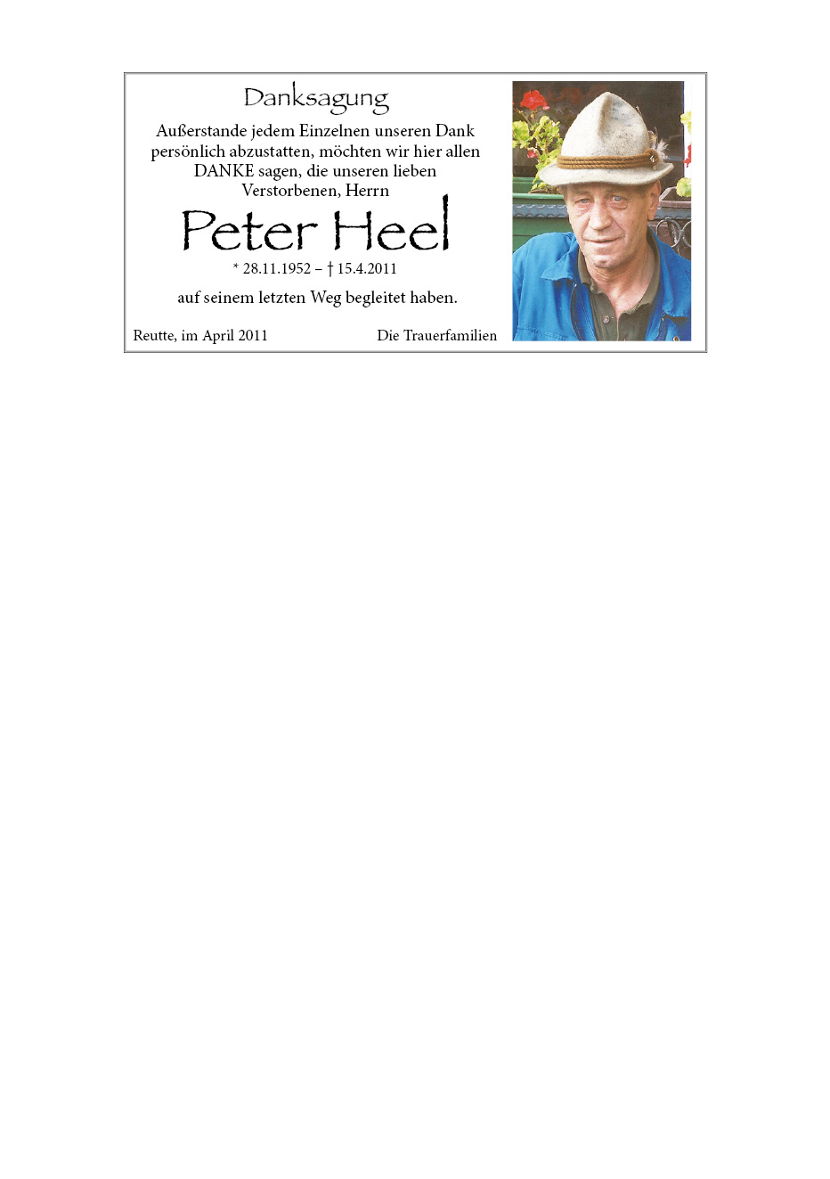 13.12.1901 15.04.2011 Reutte Peter Heel Action Parte Sterbebild Gedenkkerzen Kondolenzen Danksagung Parte Sterbebild Gedenkkerzen Kondolenzen Danksagung Parte herunterladen Sterbebild herunterladen Gedenkkerzen für Peter Heel 6 Einträge Kerze anzünden Ruhe sanft in Gottes Hand! Dein Sohn Fam. Hannes Mott Renate Praxmair Du fehlst uns sehr Alber Gottfried jun. Ihre Gedenkkerze fürPeter Heel Ihr Name* Farbe auswählen Ihre Nachricht oder Name* E-Mail-Adresse* Mit dem Klicken auf "Kerze anzünden" erklären Sie sich mit unseren Datenschutzbestimmungen einverstanden. Kondolenzbuch für Peter Heel 0 Einträge Kondolenz verfassen Ihr Abschiedsgruß an Peter Heel Ihr Name* E-Mail-Adresse* Ihre Nachricht* Mit dem Klicken auf "Gruß absenden" erklären Sie sich mit unseren Datenschutzbestimmungen einverstanden. Danksagung herunterladen
