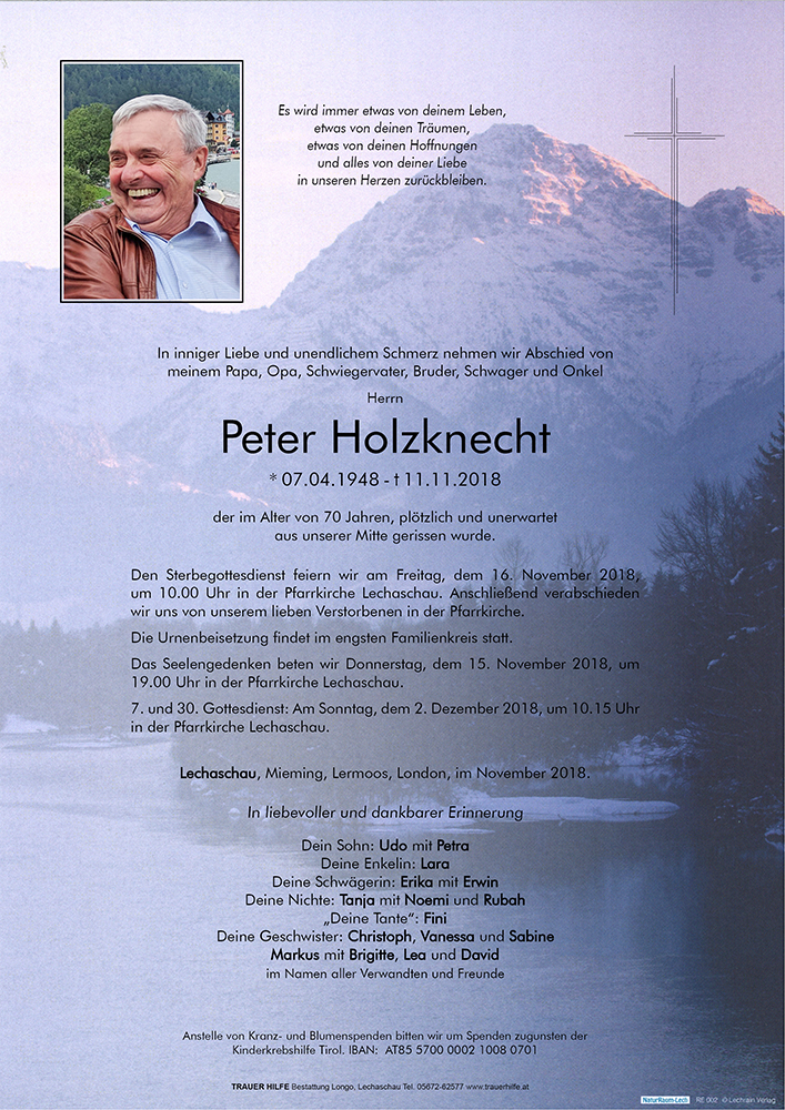 Unsere Gedanken an Peters offenes und fröhliches Wesen werden uns immer begleiten und über den schweren Verlust hinweghelfen.