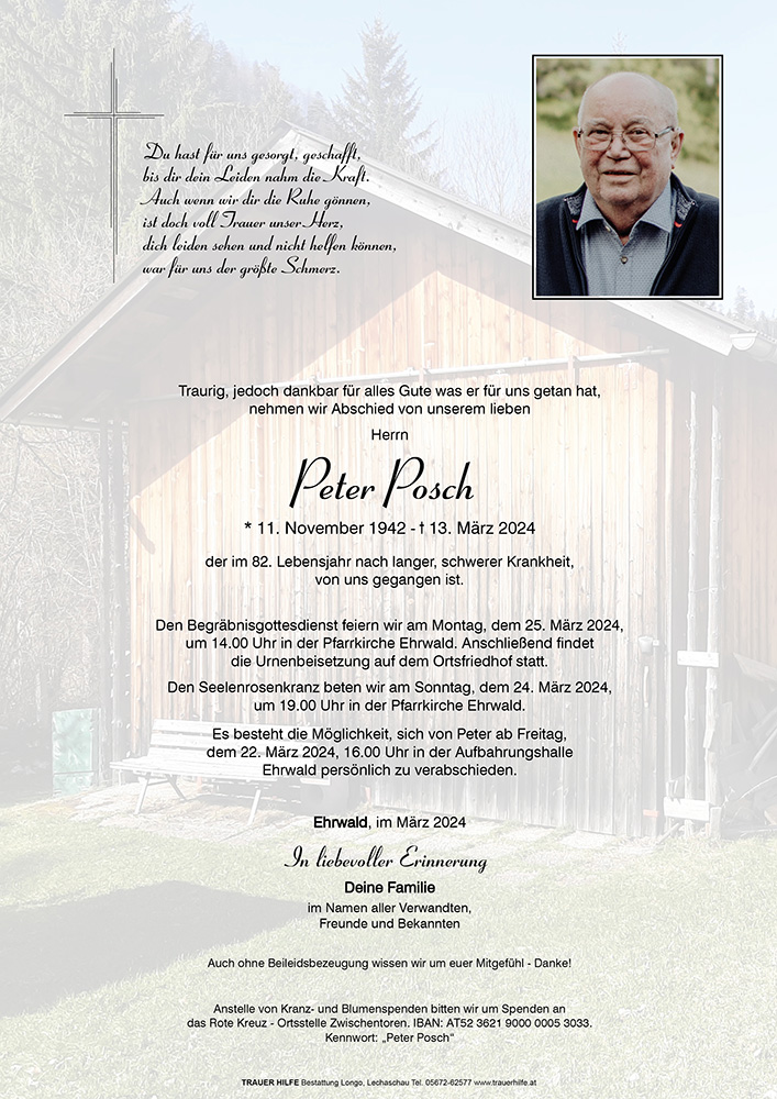 Peter ist uns vorausgegangen. Die Welt ist um ein gütiges Herz ärmer geworden. Wir erinnern uns gerne an seine freundliche, hilfsbereite, entgegenkommende und liebenswürdige Art. Was er Euch bedeutet und gegeben hat, das kann der Tod nicht auslöschen. Wir wünschen Euch Kraft und Trost in diesen schweren Tagen des Abschieds.