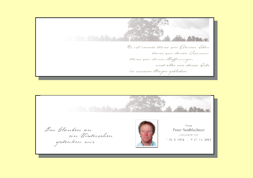 Verhallt sind Worte, die Euch bewegten. Verwehrt sind Blicke, die Euch beschenkten. Verflogen sind Gedanken, die Euch bereicherten. Vergangen sind Zärtlichkeiten, die Euch beglückten. Verflossen sind Träume, die Euch bezauberten. Und doch schimmert durch alle Schleier der Trauer ein Licht der Hoffnung. Ihr werdet Euch wieder sehr nahe sein, zeitlos und glückselig.