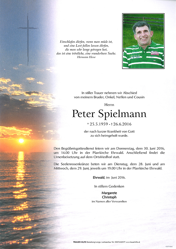 Wie oft sind wir uns auf dem Weg zur Arbeit begegnet. Desöfteren konnte ich dir behilflich sein, wenn dir das Fortkommen mit dem Rollstuhl nur schwer moglich war. Ich hab einen netten Nachbarn verloren der sein Schicksal mit bemerkenswertem Lebensmut getragen hat. Der Sribikweg in Ehrwald ist ärmer geworden. Meine Anteilnahme und Mitgefuehl entbiete ich vor allem seiner Schwester Margarete Spielmann