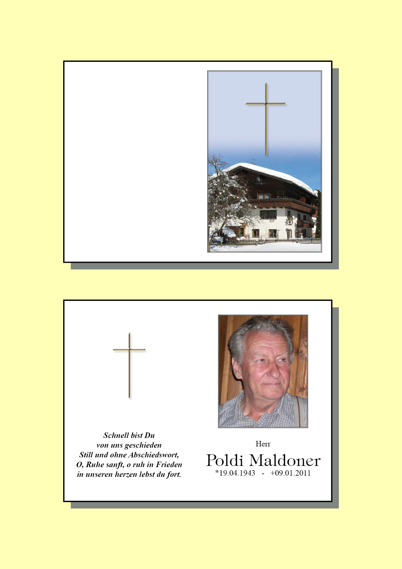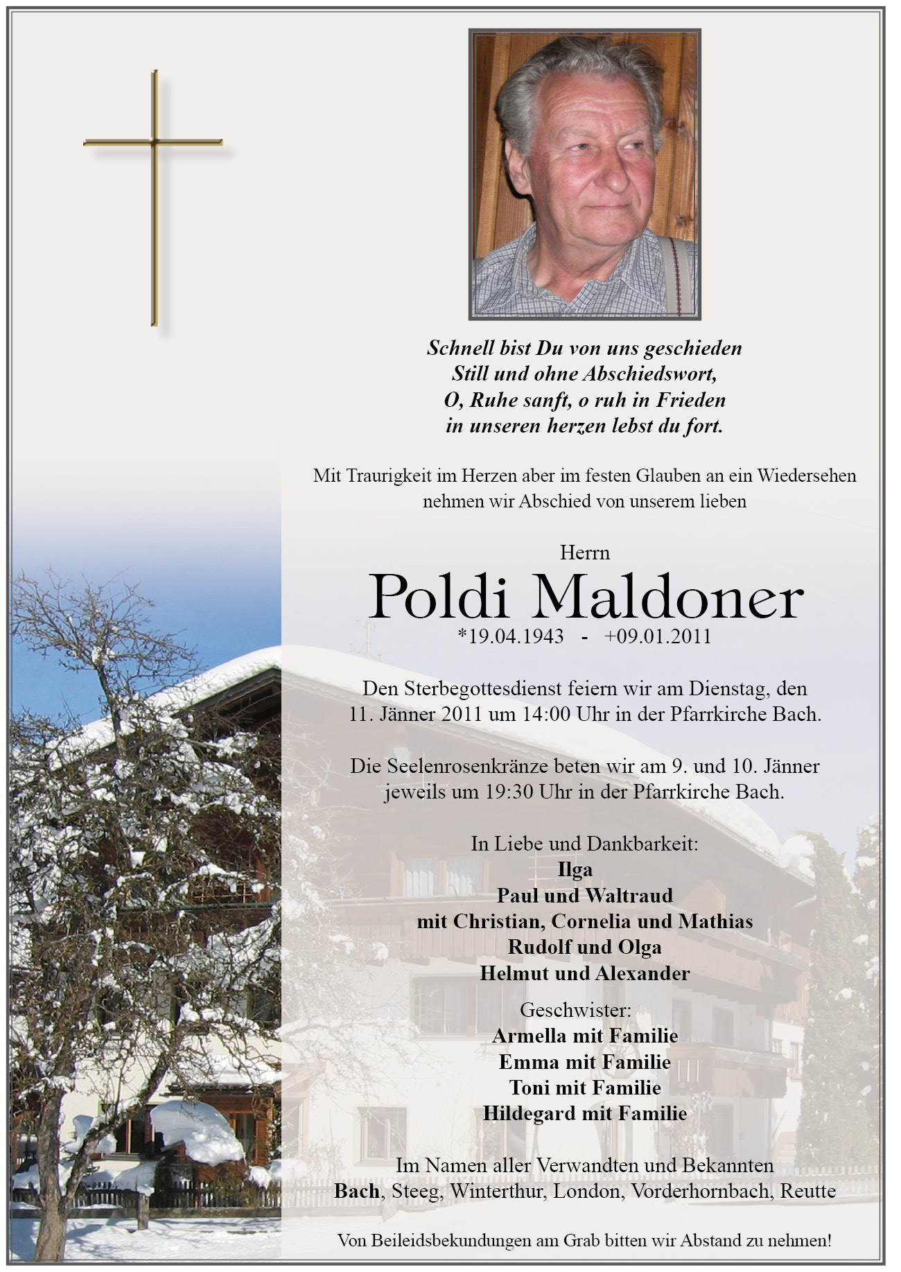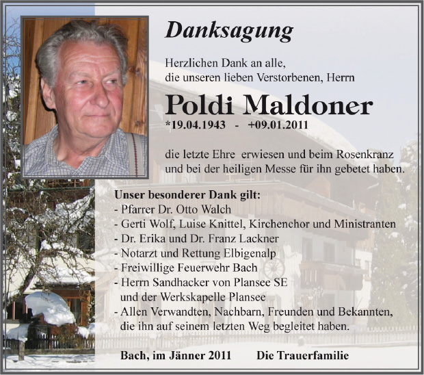 13.12.1901 09.01.2011 Bach Poldi Maldoner Action Parte Sterbebild Gedenkkerzen Kondolenzen Danksagung Parte Sterbebild Gedenkkerzen Kondolenzen Danksagung Parte herunterladen Sterbebild herunterladen Gedenkkerzen für Poldi Maldoner 13 Einträge Kerze anzünden Franziska Olga Rudolf Ruhe in Frieden Danke Ruhe in Frieden birgit und Wolfgang Helmut für dich für dich Franziska, Olga, Rudolf Helmut & Alex Ruhe in Frieden Ruhe in Frieden Ilga, Olga und Rudolf Ihre Gedenkkerze fürPoldi Maldoner Ihr Name* Farbe auswählen Ihre Nachricht oder Name* E-Mail-Adresse* Mit dem Klicken auf "Kerze anzünden" erklären Sie sich mit unseren Datenschutzbestimmungen einverstanden. Kondolenzbuch für Poldi Maldoner 0 Einträge Kondolenz verfassen Ihr Abschiedsgruß an Poldi Maldoner Ihr Name* E-Mail-Adresse* Ihre Nachricht* Mit dem Klicken auf "Gruß absenden" erklären Sie sich mit unseren Datenschutzbestimmungen einverstanden. Danksagung herunterladen