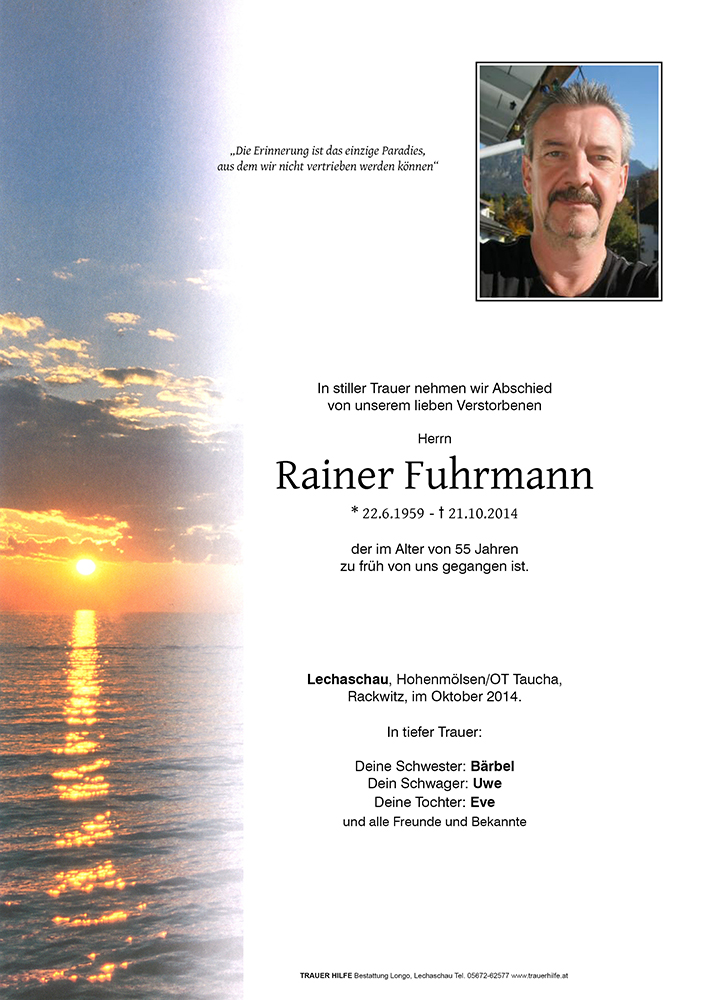 Ich wĂŒnschte Dir ein heiteres GemĂŒt und ein herzliches Lachen, gerade in den Zeiten ernster und bedrĂŒckender Gedanken. Ich wĂŒnschte Dir Fröhlichkeit mit Zuversicht nach vorn zu blicken, um Dir Kraft zu geben. Ich wĂŒnschte Dir die FĂ€higkeit zur Freude, Dich ĂŒber kleine Dinge und Erfolge glĂŒcklich zu schĂ€tzen. Doch ohne ausreichend Zeit, waren meine WĂŒnsche nur halb so viel wert. Zeit ist ein kostbares Gut und schenkt mehr Freude, als alle ReichtĂŒmer dieser Welt. Zeit, die Du, lieber Rainer, leider nicht mehr hattest. Dein Lebensweg verlief zwar nicht immer schnurgerade und Du hast manchen Fehler gemacht. Aber eines kannst Du sagen: Du hast Dein Leben nach Deiner Art gelebt.