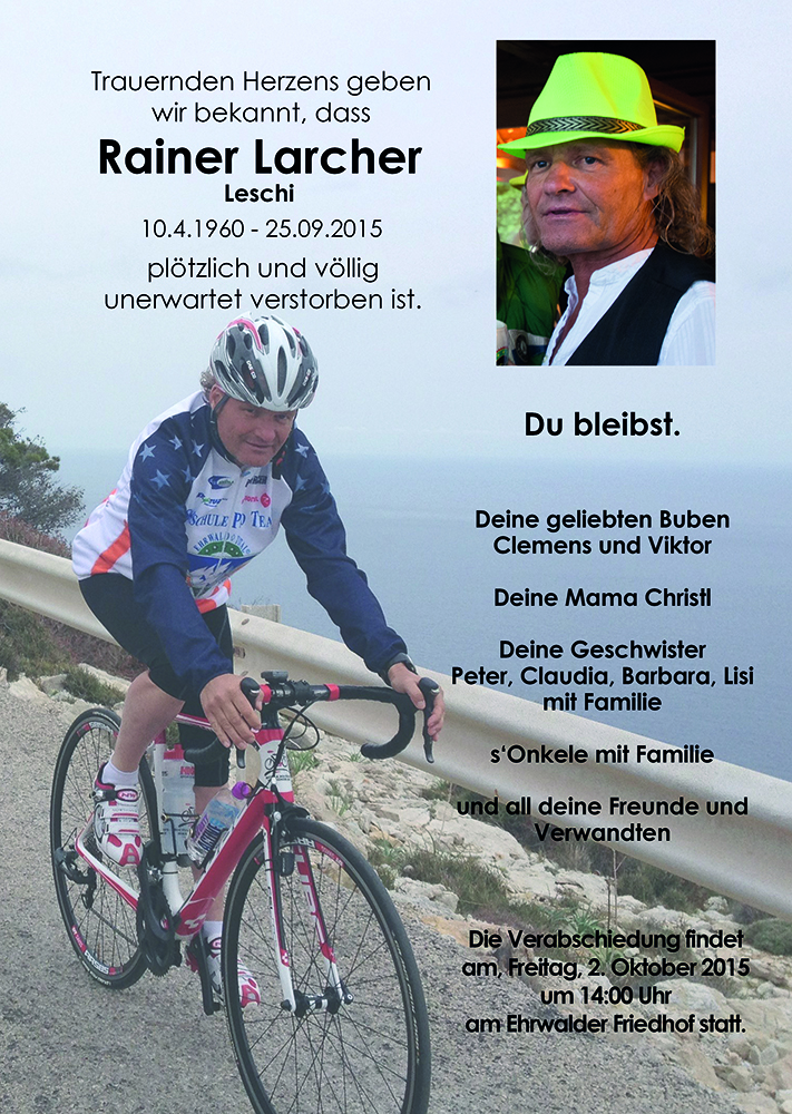 Ich habe es erst heute erfahren und bin geschockt. Mein aufrichtiges Beileid der Familie. Wünsch euch viel Kraft für in dieser schwere Zeit. Er war ein toller Chef. Hatten ne tolle Zeit und es sehr lustig auf der Gams Alm. Er wird immer in unseren Herzen bleiben. Ruhe in Frieden Rainer deine damalige Mitarbeiterin Susanne