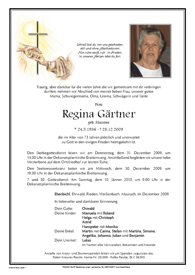 13.12.1901 28.12.2009 Ehenbichl Regina Gärtner Action Parte Gedenkkerzen Kondolenzen Parte Gedenkkerzen Kondolenzen Parte herunterladen Gedenkkerzen für Regina Gärtner 81 Einträge Kerze anzünden Du fehlst! Benjamin Vermisse dich Oma Markus Markus Du fehlst mir sehr ❤️! Johanna Denken an die oma ❤️ Julian Ich vermisse dich Oma Johanna Ruhe in Frieden! Benjamin In Liebe und Dankbarkeit Ich vermisse dich Oma Johanna Du fehlst mir sehr! Johanna Ich vermisse dich Oma Johanna Du fehlst mir! Johanna Ich vermisse dich sehr Johanna Ich vermisse dich Oma Johanna Bernadette In Liebe und Dankbarkeit! Du fehlst mir sehr! Johanna Du fehlst mir sehr! Johanna Fam. Salvenmoser Christoph Du fehlst mir! Benjamin Ich vermisse dich sehr Oma Ich brauche dich Oma Johanna In Liebe und Dankbarkeit Oma du fehlst mir sehr Ich brauche dich Oma Johanna Liebe Grüße in den Himmel Ich vermisse dich Oma Ich liebe dich von ganzen herz Ein Licht für Dich ! In Liebe und Dankbarkeit ! Markus wir vermissen dich Oma in Licht für Dich! Wir vermissen dich Oma In Liebe und Dankbarkeit! Wir vermissen Dich Oma In liebevoller Erinnerung! In Gedanken bei dir. Simone Ich vermisse dich Oma Johanna Ein Licht für Dich ! In liebevoller Erinnerung ! Wir lieben dich julian, beni Ich vermisse dich Oma. Johanna In liebevoller Erinnerung ! Ruhe in Frieden In liebevoller Erinnerung Oma du fehlst mir julian! Du warst immer für mich da! Wiso bist du von uns gegangen? Wir denken oft an dich! Ich hab dich lieb! Benjamin Ein Licht für dich! Fam. Alber Walter Ruhe in Frieden In liebevoller Erinnerung Ich vermisse dich Oma In Liebe Familie Alber Walter In Liebe und Dankbarkeit Ich vermisse dich Oma! Johanna In stillem Gedenken Bernadette Wir vermissen dich . . ein Lichtlein für dich ! Ich hab dich lieb! Du fehlst uns! Ich vermisse dich Oma! Ich vermisse dich Oma! Johanna Zum Gedenken! Fam. Alber Walter Du fehst mir! Ich hab dich lieb. . . . ein Lichtlein für Dich. . . Fam. Alber Wir vermissen dich! Du fehlst uns! Für dich, Oma! Benjamin Friede und Freude Ich hab dich lieb Oma ! Ihre Gedenkkerze fürRegina Gärtner Ihr Name* Farbe auswählen Ihre Nachricht oder Name* E-Mail-Adresse* Mit dem Klicken auf "Kerze anzünden" erklären Sie sich mit unseren Datenschutzbestimmungen einverstanden. Kondolenzbuch für Regina Gärtner 0 Einträge Kondolenz verfassen Ihr Abschiedsgruß an Regina Gärtner Ihr Name* E-Mail-Adresse* Ihre Nachricht* Mit dem Klicken auf "Gruß absenden" erklären Sie sich mit unseren Datenschutzbestimmungen einverstanden.