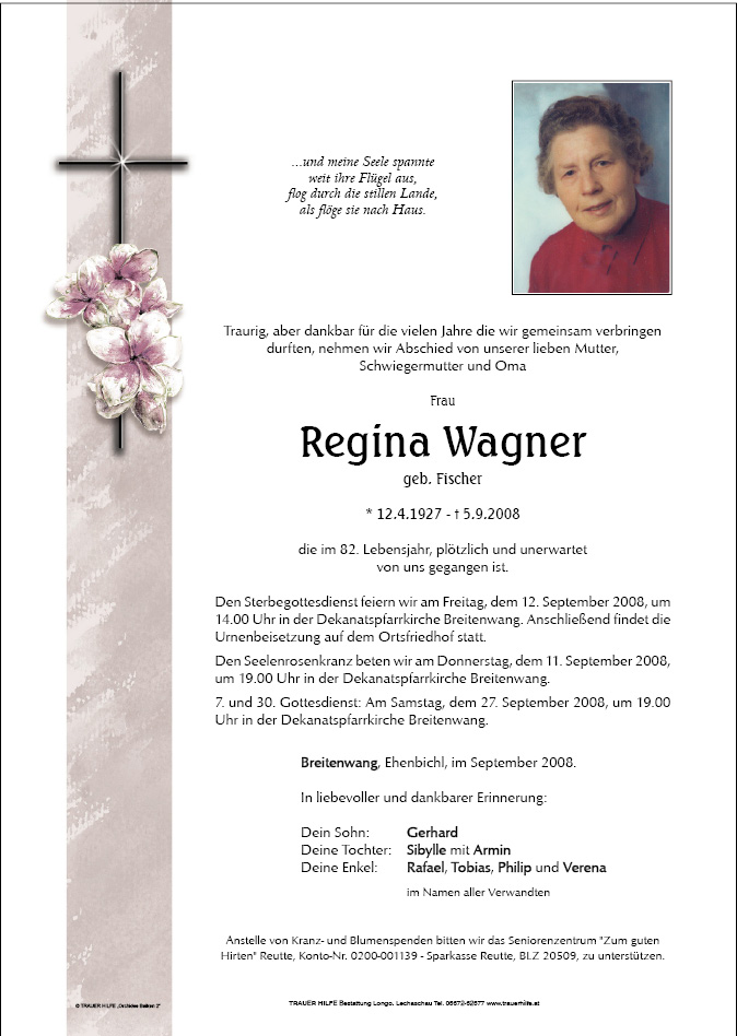 13.12.1901 05.09.2008 Breitenwang Regina Wagner Action Parte Gedenkkerzen Kondolenzen Parte Gedenkkerzen Kondolenzen Parte herunterladen Gedenkkerzen für Regina Wagner 0 Einträge Kerze anzünden Ihre Gedenkkerze fürRegina Wagner Ihr Name* Farbe auswählen Ihre Nachricht oder Name* E-Mail-Adresse* Mit dem Klicken auf "Kerze anzünden" erklären Sie sich mit unseren Datenschutzbestimmungen einverstanden. Kondolenzbuch für Regina Wagner 0 Einträge Kondolenz verfassen Ihr Abschiedsgruß an Regina Wagner Ihr Name* E-Mail-Adresse* Ihre Nachricht* Mit dem Klicken auf "Gruß absenden" erklären Sie sich mit unseren Datenschutzbestimmungen einverstanden.