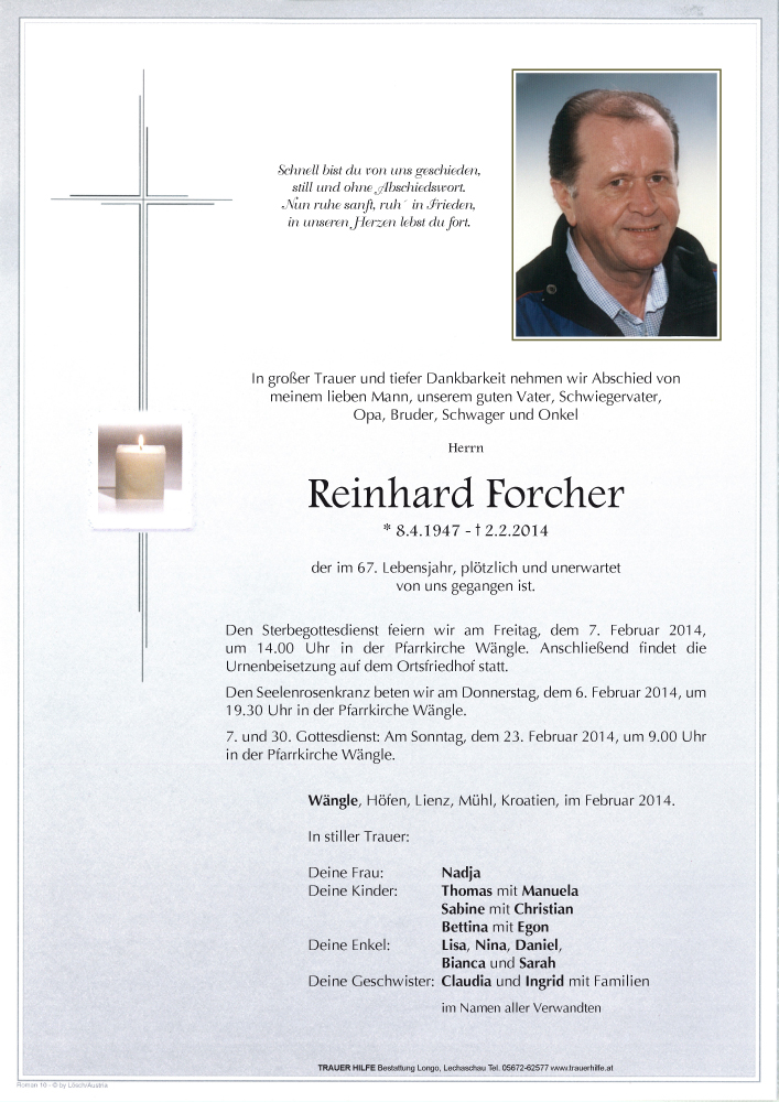 Reinhardt war ein feiner u.herzlicher mensch hab ihn gerne mögen als meinen damaligen chef der firma ags herzliches beileid dir liebe nadia u der trauerfamilie u viel kraft in dieser schweren zeit