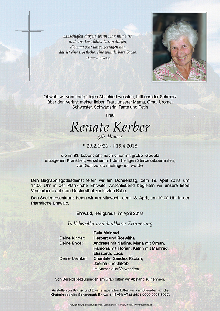 Nach langem Leiden hat der liebe Gott nun Renate zu sich gerufen. Wir wünschen euch viel Kraft und Stärke für die kommende schwere Zeit. In Gedanken sind wir bei euch Gerlinde und Hansi
