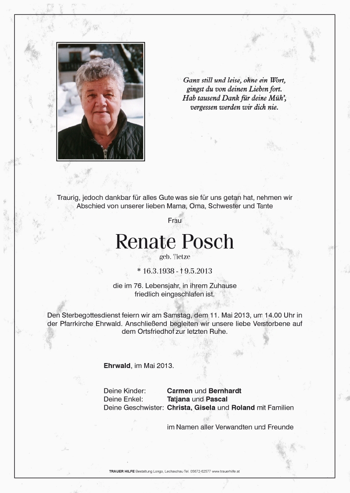 erst noch haben wir über deine Mama gesprochen. Wir werden sie in lieber Erinnerung als unsere stille Nachbarin behalten.