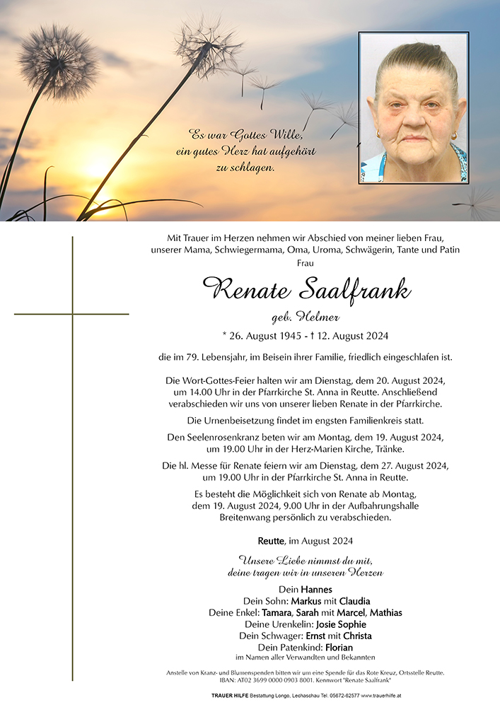 Liebe Renate, Gott wird Dich mit viel Freude begrüßen und Dir ein gutes Zuhause bieten. Danke, dass wir ein bisschen an Deinem Leben teilhaben durften. Leb wohl.