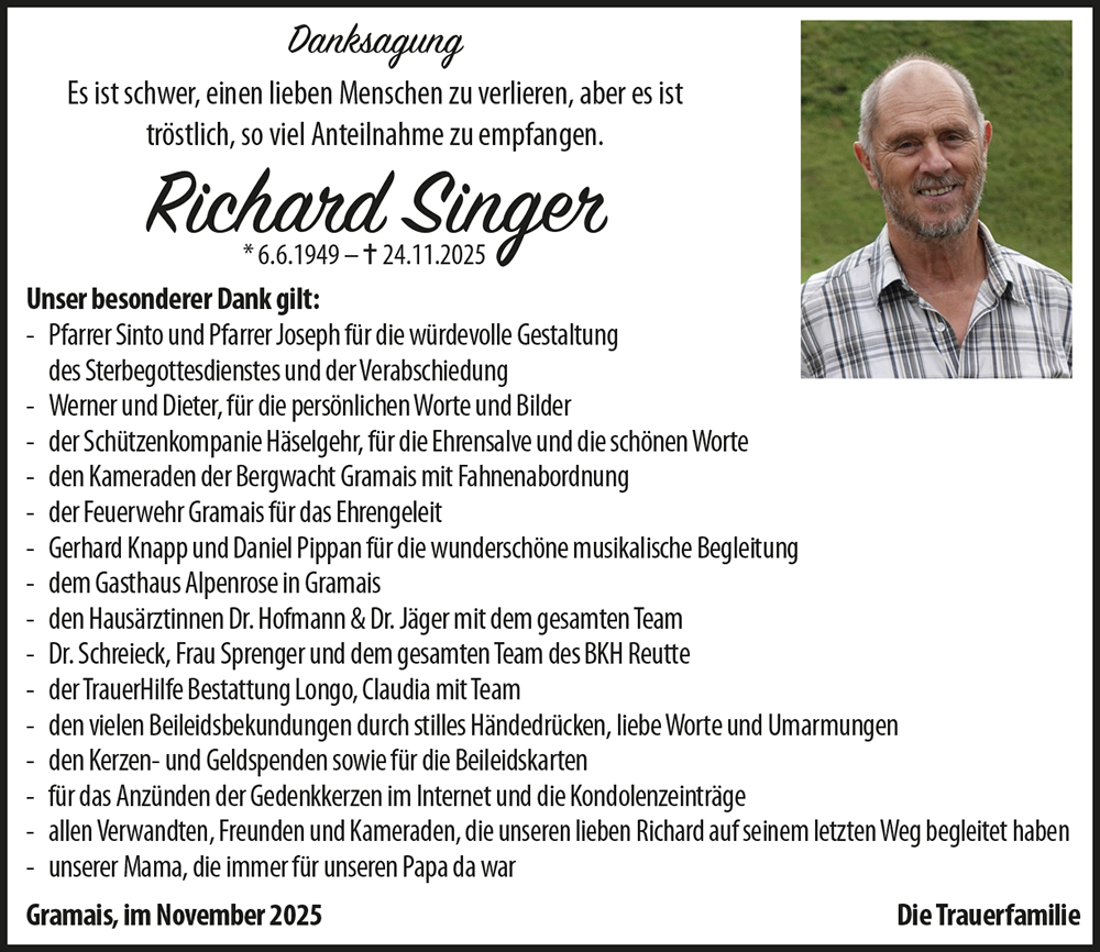 und dem damit verbundenen „Herzschmerz“, durch den Weggang von Richard, als Ehemann, Vater, Opa, Bruder, etc. - zu trösten.