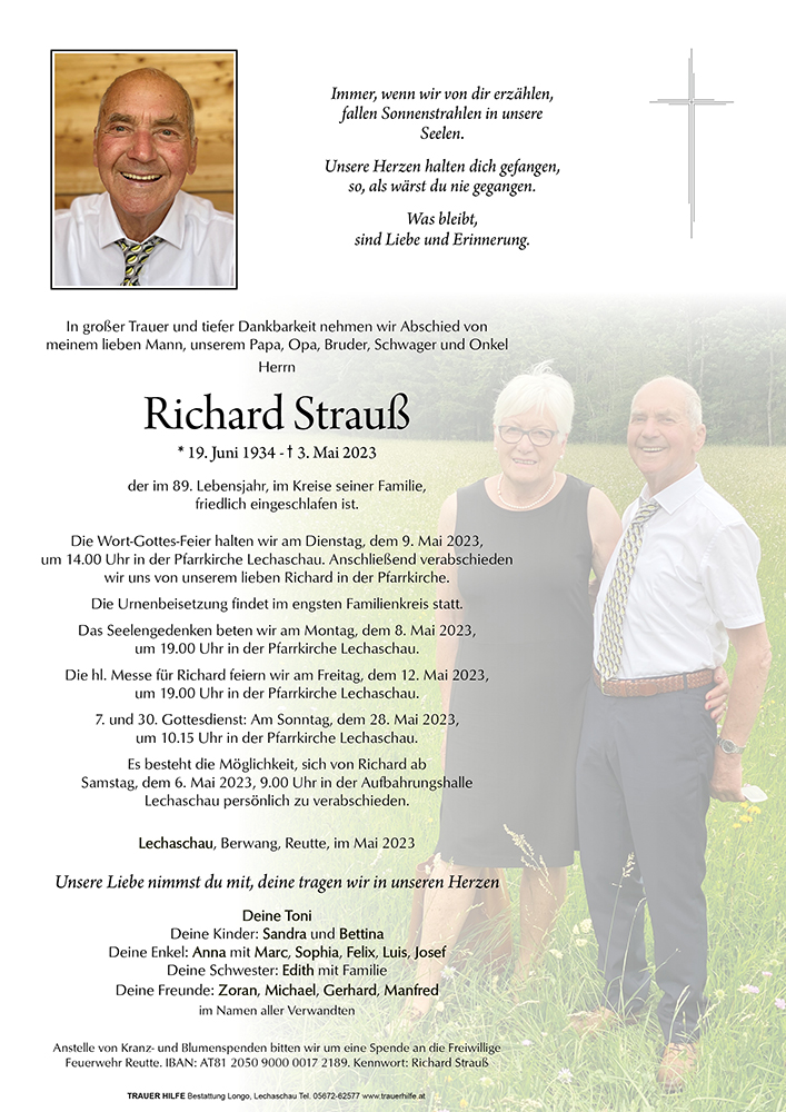 Liebe Toni, werte Trauerfamilie! Mein aufrichtiges Beikeud zum Heimgang vom kieben Richard! Ich denje ift ab ubseren gemeibsamen Stunden die wir verbribgeb durften. Lueber Richard ruhe in Frieden. LISI??