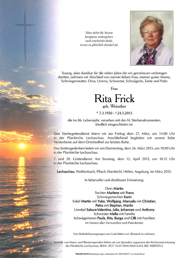 Seit nicht traurig, dass Rita zu ihrem Herrn und Schöpfer heimgekehrt ist, denkt an die schönen und langen Tage die sie mit euch im Kreis eurer Familien verbringen durfte.