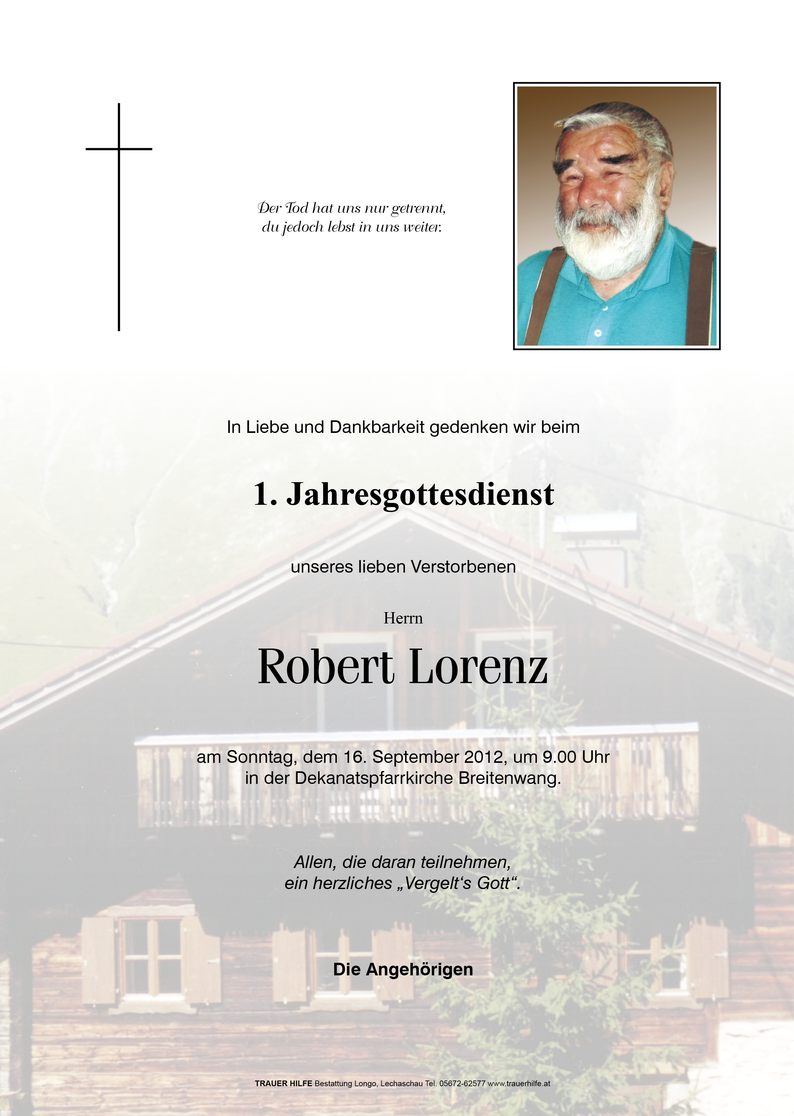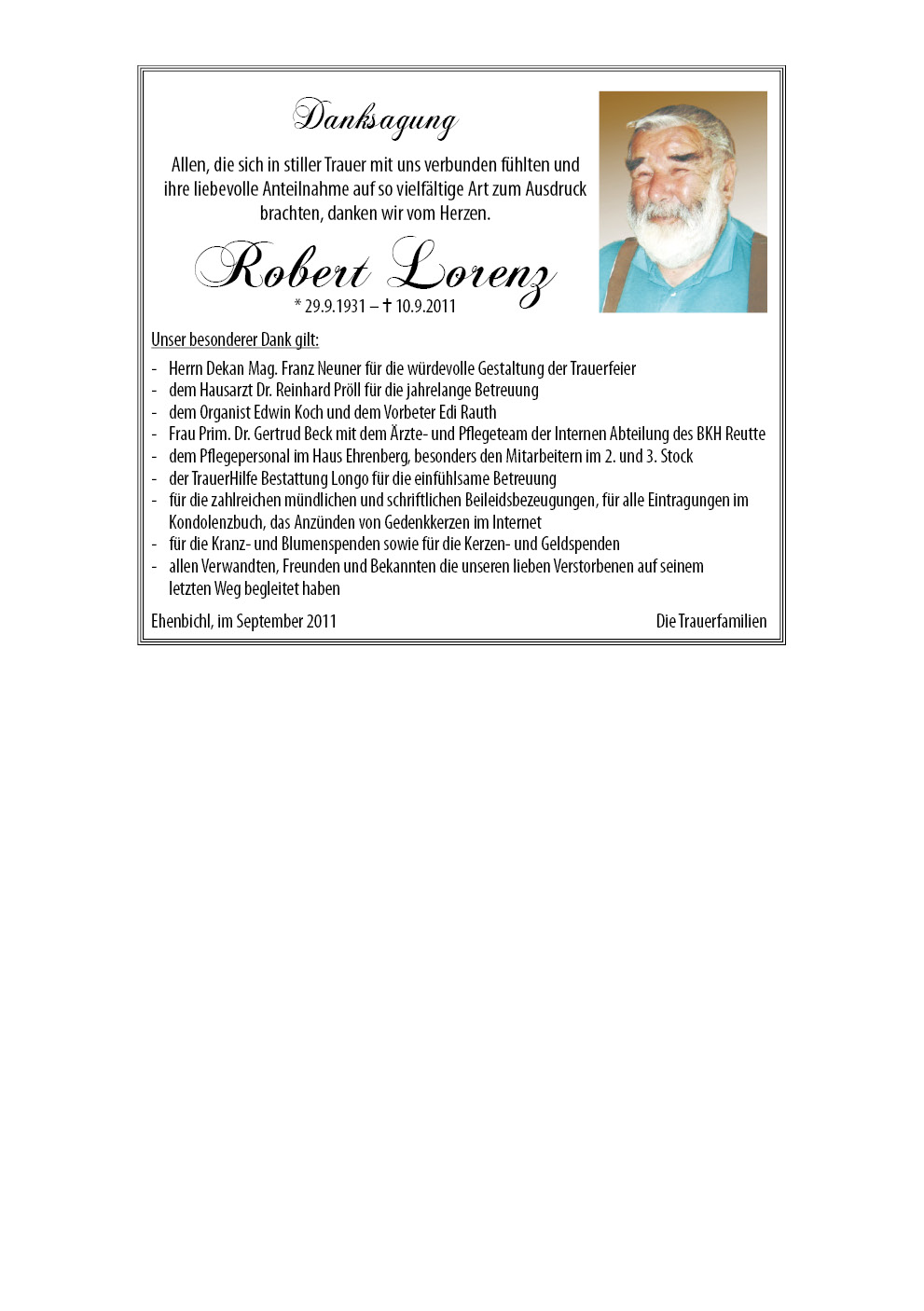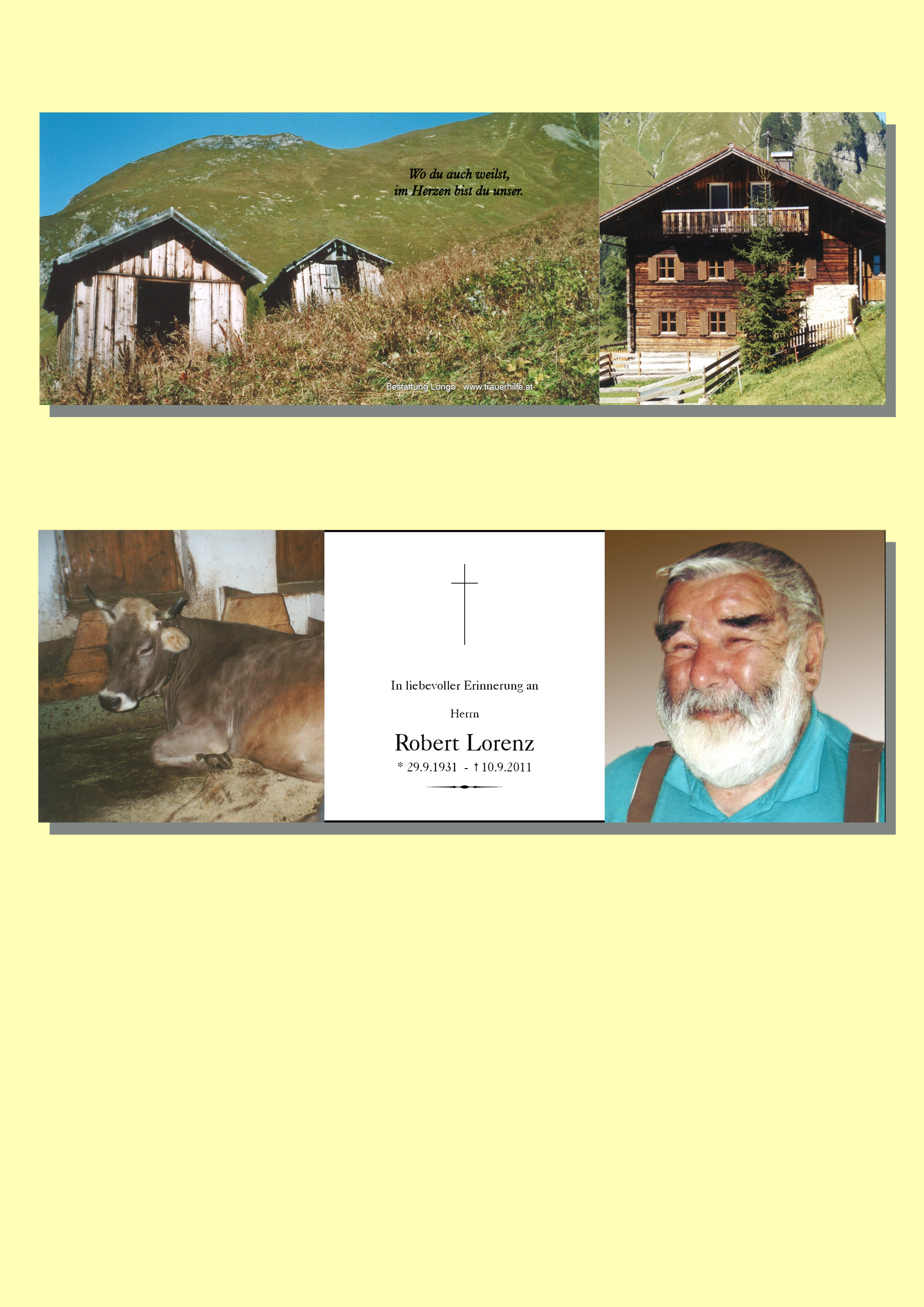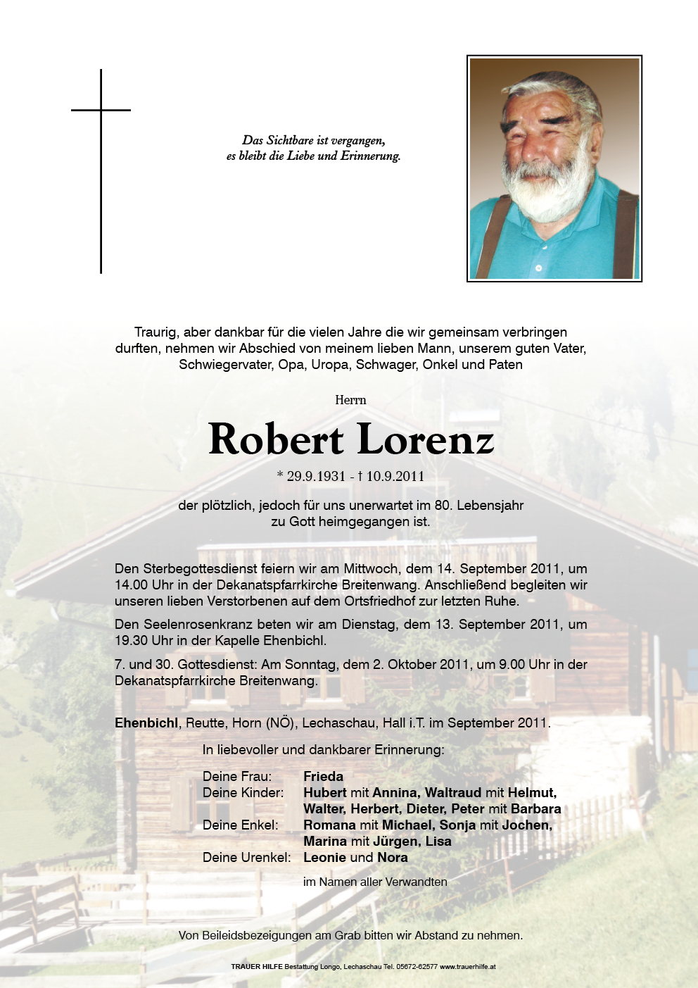 13.12.1901 10.09.2011 Ehenbichl Robert Lorenz Action Parte Sterbebild Gedenkkerzen Kondolenzen Danksagung Jahrestag Parte Sterbebild Gedenkkerzen Kondolenzen Danksagung Jahrestag Parte herunterladen Sterbebild herunterladen Gedenkkerzen für Robert Lorenz 5 Einträge Kerze anzünden ein Licht für Tati Fam. Andreas u. Angelika Berger für deinen Seelenfrieden ruhe in Frieden Fam. Günter und Gitti Muglach Ihre Gedenkkerze fürRobert Lorenz Ihr Name* Farbe auswählen Ihre Nachricht oder Name* E-Mail-Adresse* Mit dem Klicken auf "Kerze anzünden" erklären Sie sich mit unseren Datenschutzbestimmungen einverstanden. Kondolenzbuch für Robert Lorenz 0 Einträge Kondolenz verfassen Ihr Abschiedsgruß an Robert Lorenz Ihr Name* E-Mail-Adresse* Ihre Nachricht* Mit dem Klicken auf "Gruß absenden" erklären Sie sich mit unseren Datenschutzbestimmungen einverstanden. Danksagung herunterladen Jahrestag herunterladen