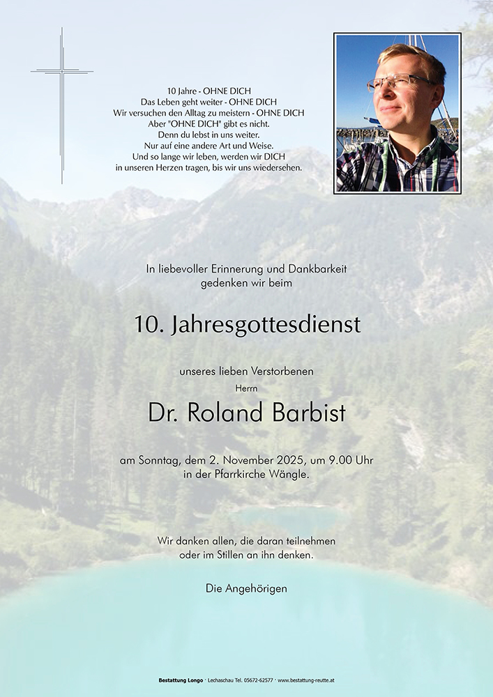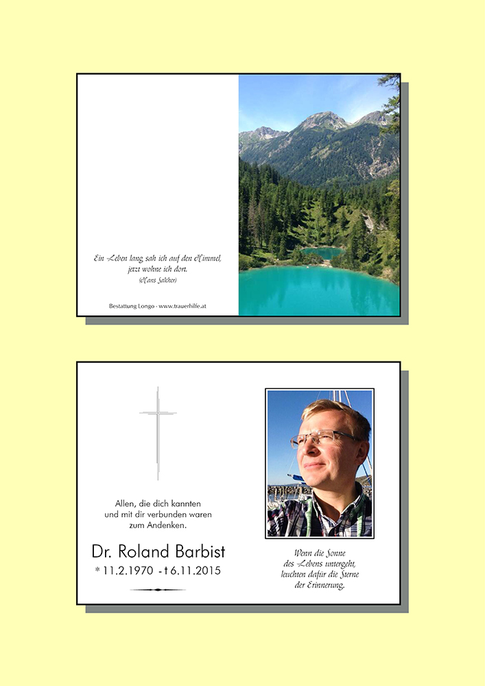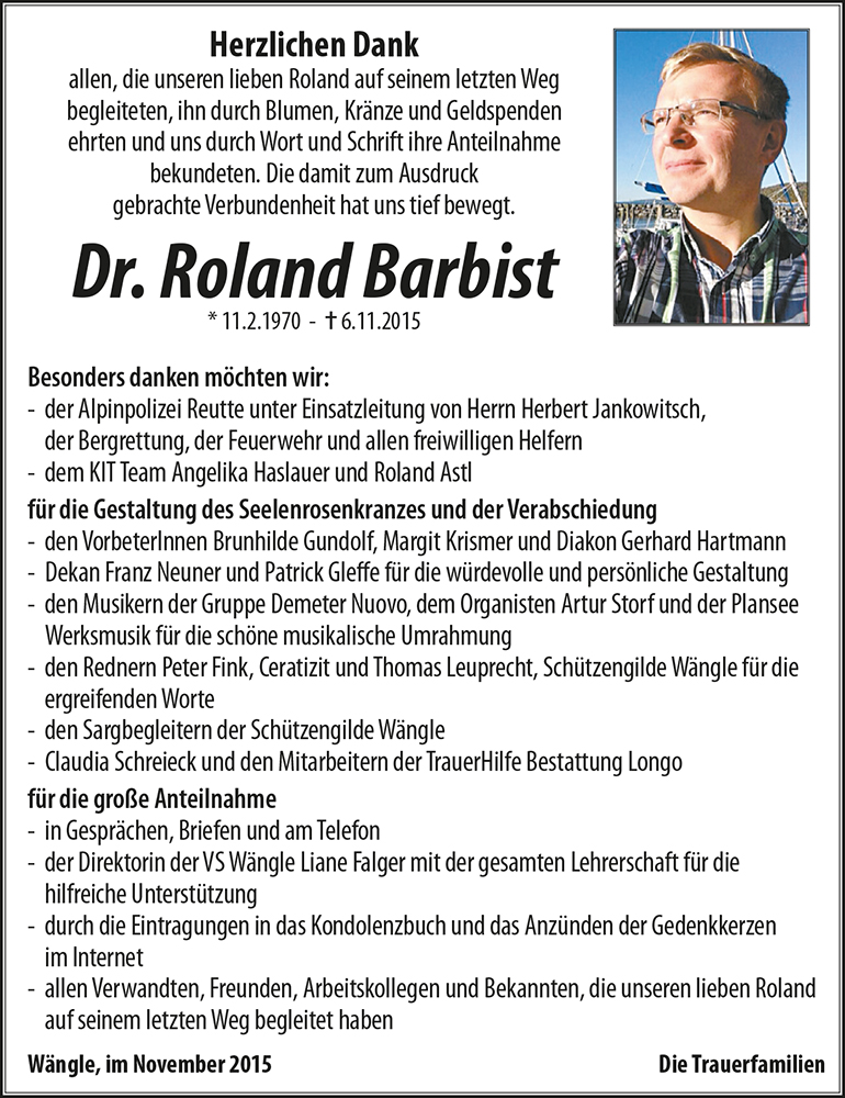 zu unserem aufrichtigen Bedauern erfuhren wir, dass Herr Dr. Roland Barbist vor kurzem verstorben ist. Worte können den Schmerz nicht ausdrücken, den Sie gerade durchleiden. Mit Dr. Roland Barbist ist ein wirklich einzigartiger und geschätzter Mensch von uns gegangen. Wir schätzen uns glücklich, ihn kennen gelernt zu haben und werden Herrn Dr. Barbist in dankbarer Erinnering halten.