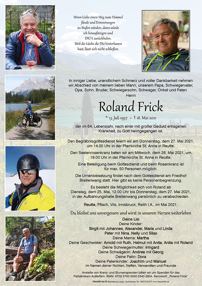 Ich bin ganz erschrocken, als ich die Parte von Roland gesehen habe und auch traurig, dass nun auch du und deine Familie diesen endgültigen Abschied nehmen müsst. Ich kann nur mitfühlen und euch viele gute und liebe Menschen an eurer Seite wünschen, die euch durch diese schwierige Zeit begleiten. Roland wird immer an eurer Seite bleiben. Lisi, es wird viele Auf und Ab‘s geben - ich weiß es aus meiner Erfahrung, aber es geht immer vorwärts. Es gibt eine Kraft, die uns trägt - es ist die Liebe, die verbindet und immer bleibt.