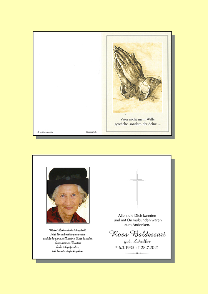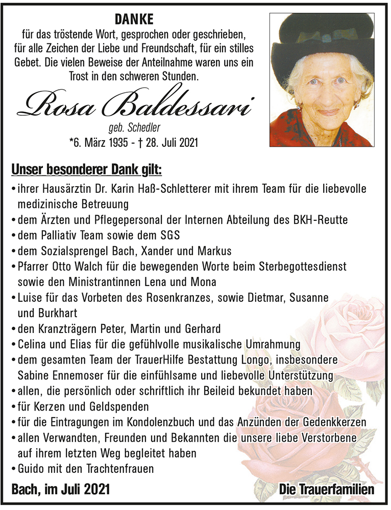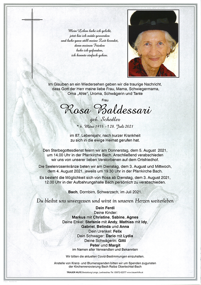 06.03.1935 28.07.2021 Bach Rosa Baldessari Action Parte Sterbebild Gedenkkerzen Kondolenzen Danksagung Parte Sterbebild Gedenkkerzen Kondolenzen Danksagung Parte herunterladen Sterbebild herunterladen Gedenkkerzen für Rosa Baldessari 111 Einträge Kerze anzünden Dem Auge fern, dem Herzen nah Im Gedenken an Dich . . . habs fein im Himmel ! Fam. Thomas u. Anita Lutz Fam. Thomas u. Anita Lutz Fam. Thomas u. Anita Lutz Fam. Thomas u. Anita Lutz Senioren Häselgehr Fam. Thomas u. Anita Lutz Fam. Thomas u. Anita Lutz Josef Perle Fam. Thomas u. Anita Lutz Christoph, Martina, Lena&Mona Fam. Thomas u. Anita Lutz Fam. Thomas u. Anita Lutz Walter & Brigitte Fam. Thomas u. Anita Lutz Im Gedenken Christine Perle Walter & Brigitte Fam. Angelika u. Jürgen Perle Strobl Inge Ruhe in Frieden Irene und Barbara Fabienne und Serkan mit Kindern Maria und Fritz Gebhard Fam. Peter und Eva-Maria Bernhard Fam. Silke und Alexander Wörle Herma und Marcel Bayard-Haider Adolf und Lisi Walch mit Fam. Familie Elisabeth Walch, Kaisers Knoll Angelika mit Familie Celine Marianne und Stefan Erich Geiss, Ruhe in Frieden Ruhe in Frieden Berta Petra Singer Renate & Günter Krämer mit Familie Ruhe in Frieden In stillem Gedenken Bruno und Edeltraud Schorsch und Maria Christine Fam. Dagmar Haider Ruhe in Frieden , Josef Perle Fam. Birgit Falger Fam. Thomas u. Anita Lutz Fam. Schärmer Thomas Kramer Fam. Klaus Schnöller Christl & Leo Fam. Kurt und Blanka Larcher Ines & Franz mit Hannah & Jakob Ruhe in Frieden Vera mit Marina Fam. Michael und Walli Hosp Ruhe in Frieden, Elmar und Grete Wolf Uschi & Simon Pixner Alexander u. Nici Neubauer Wasle Andrea mit Familie Robert u. Brigitte Heel Fam. Wolfgang & Elli Köpfle Ruhe in Frieden. Daniela mit Anna u. Yannick Hermine Moosbrugger Elmen Roland u. Maria Schottenhamml Fam. Roland und Claudia Strobl Sonja und Andreas mit Gabriel, Romina Hannelore und Manfred Zoppel Wolfgang mit Familie Im Gedenken Christine Perle Walter und Gerlinde Mages Grünau Tatjana mit Familie Elmen Köck Martina mit Familie Marina u. Benny mit Noah u. Lea Fam. Pitschnau Fam. Claudia und Simon Walch Fam. Michael & Sabrina Moosbrugger Familie Johann u. Beatrix Schuler Fam. Peter und Eva-Maria Bernhard Rainer und Silvia Fam. Kammerlander Monika Ruhe in Frieden Singer Hannelore Mario und. Barbara Rief Linda & Georg Johann & Vroni Irma und Dagmar mit Fam. Victoria & Flo mit Sarah & Selina Toni und Gudrun Hofmann Melanie und Jürgen Schedler Fam. Andreas und Sigrid Matti Fam. Kapeller Marlene u. Bernhard Dunja Dobler Michaela Lorenz mit Familie Senioren Häselgehr Walter & Brigitte A Liacht auf, m Weg Fam. HuberWinkl Julia und Gebhard Grünau Roswitha Feistenauer Josef und Anita Walch-Lang Mathilde Schlichtherle-Frey & Lena-Maria Fam. Georg + Viktoria Drexel Manuela, Dominik und Daniel Baldauf Moosburgger Patrick Klaus&Nicole mit Marcel & Larissa Fam. Hugo Huber Lucas + Levi Gezzele Fam. Markus u. Andrea Brandmayer Hildegard und Walter Frey Ulli und Werner Wolf Fam. Maria und Erich Friedl Fam. Monika Hammerle Holzgau Sabine Ennemoser Claudia Schreieck TrauerHilfe Bestattung Longo Ihre Gedenkkerze fürRosa Baldessari Ihr Name* Farbe auswählen Ihre Nachricht oder Name* E-Mail-Adresse* Mit dem Klicken auf "Kerze anzünden" erklären Sie sich mit unseren Datenschutzbestimmungen einverstanden. Kondolenzbuch für Rosa Baldessari 1 Eintrag Kondolenz verfassen Wir sind nur Gast auf Erden und wandern ohne Ruh‘ mit mancherlei Beschwerden der ewigen Heimat zu. Ruhe in Frieden 31.07.2021 um 10:58 Uhr Ihr Abschiedsgruß an Rosa Baldessari Ihr Name* E-Mail-Adresse* Ihre Nachricht* Mit dem Klicken auf "Gruß absenden" erklären Sie sich mit unseren Datenschutzbestimmungen einverstanden. Danksagung herunterladen
