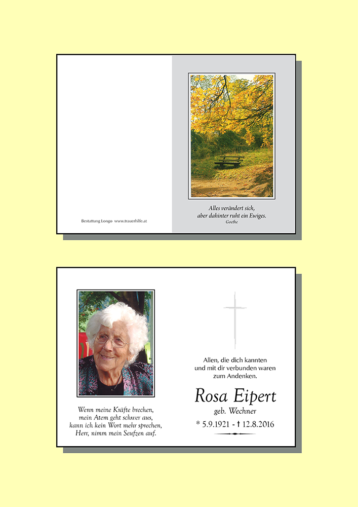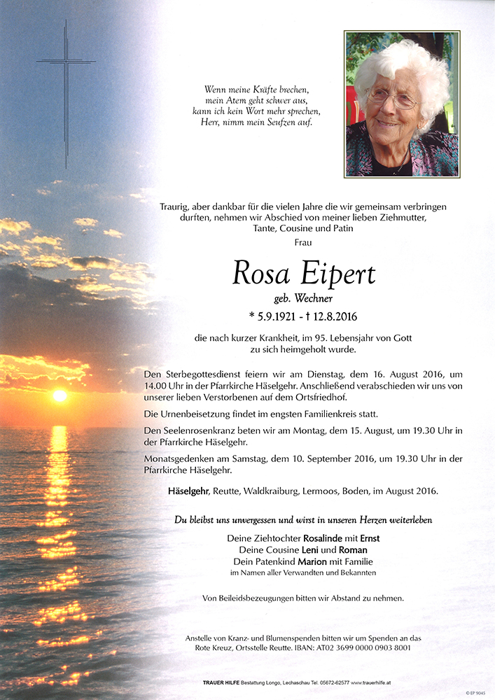 05.09.1921 12.08.2016 Häselgehr Rosa Eipert Action Parte Sterbebild Gedenkkerzen Kondolenzen Danksagung Parte Sterbebild Gedenkkerzen Kondolenzen Danksagung Parte herunterladen Sterbebild herunterladen Gedenkkerzen für Rosa Eipert 57 Einträge Kerze anzünden Fam. Walch-Lang Barbara Schweißgut Senioren Häselgehr Senioren Häselgehr Franz Kohler Rosi und Ernst Sylvia Fringer Ruhe in Frieden Margit Wolf Benedetter Gerti Traudl Höfling Fam. Manfred Holzmann Fam. Elly Kapeller Franz Kohler Fam. Christine Oberforcher Fam. Hammerle Rosmarie Emanuela Helene Sonnweber Weißenb. Sissi Walter Scheiber Robin Koch Singer Hannelore Olga, Martin & Evi Helga Raffler Waltraud u. Michael Hosp Maria Lang Koch Andy, Doris und Sandro Angelika mit Gerhard Martin und Vroni Meinrad und Brigitte Scheiber Rita Gruber Fam. Kapeller Marlene u. Bernh Weirather Jakob Robert & Lisette Gabriele Bader m. Kindern Senioren Häselgehr Josefine Kerle Maria Lang Josef u. Anita Walch-Lang Waltraud und Hartmut Fam. Marion u. Herbert Lang Fam. Eugen u. Charlotte Ladner Rosi und Ernst Rosi und Ernst Lederhilger Klara Wilfried + Angelika m. Fam. Ein licht für deine Reise ruhe in frieden roman perktold ruhe in frieden leni perktold Haus Ehrenberg Wohnbereich 1 Barbara Schweißgut Haus Ehrenberg, Wohnbereich 4 Frischmann Walter Elisabeth u. Helmut Boden Franz Kohler Evi Steiner Claudia Schreieck TrauerHilfe Bestattung Longo Ihre Gedenkkerze fürRosa Eipert Ihr Name* Farbe auswählen Ihre Nachricht oder Name* E-Mail-Adresse* Mit dem Klicken auf "Kerze anzünden" erklären Sie sich mit unseren Datenschutzbestimmungen einverstanden. Kondolenzbuch für Rosa Eipert 1 Eintrag Kondolenz verfassen Ruhe in Frieden Rosa Evi 13.08.2016 um 13:43 Uhr Ihr Abschiedsgruß an Rosa Eipert Ihr Name* E-Mail-Adresse* Ihre Nachricht* Mit dem Klicken auf "Gruß absenden" erklären Sie sich mit unseren Datenschutzbestimmungen einverstanden. Danksagung herunterladen