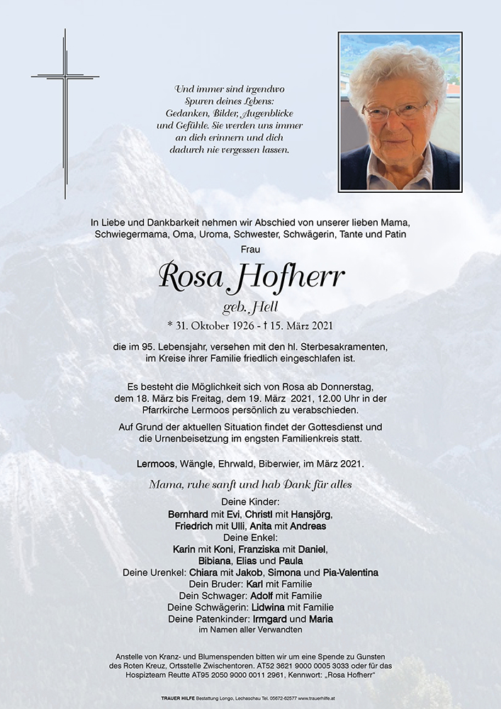 Wir wünschen euch allen von ganzem Herzen ganz viel Kraft und Zuversicht,schöne Erinnerungen und Momente an eure Mutter ,die siefür euch unvergessen machen. Rosina wird immer in euren Herzen weiterleben. Herzlichst