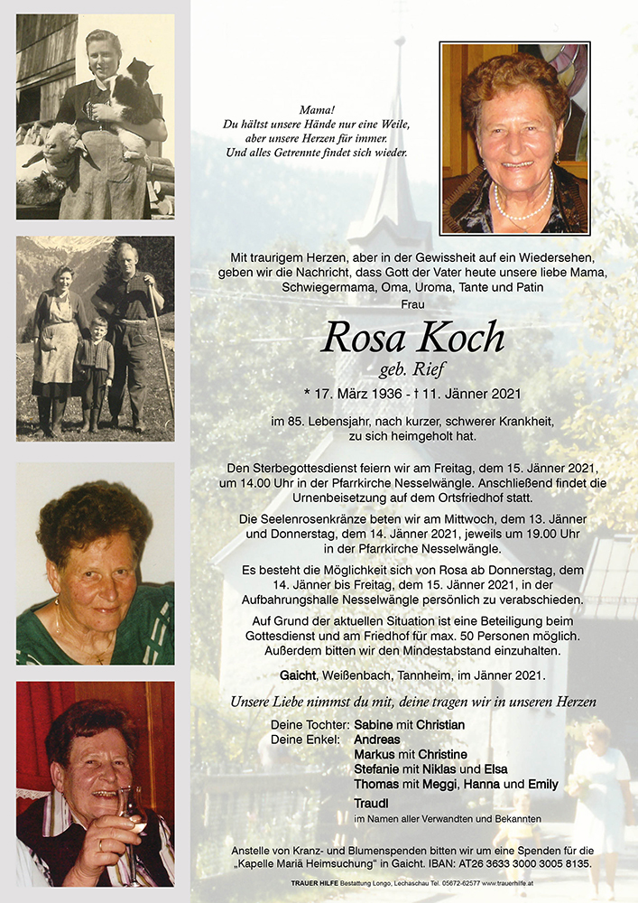 Die Nachricht von Rosas Tod hat uns sehr traurig gemacht. Gerne denken wir an die vielen schönen Urlaube und die fröhlichen Stunden bei Rosa und Werner auf Gaicht zurück. Wir werden Rosa in lieber Erinnerung behalten und wünschen Euch viel Kraft in dieser schweren Zeit.