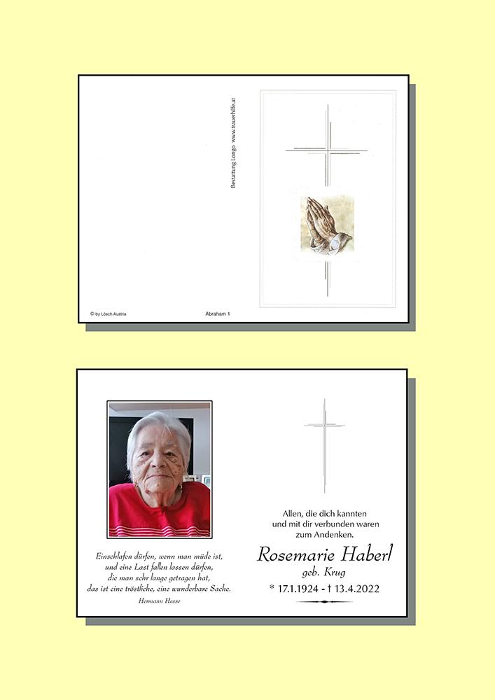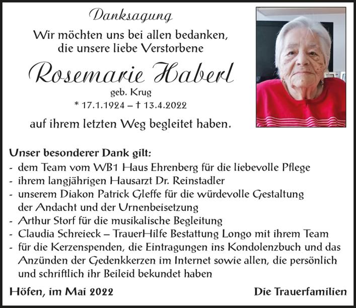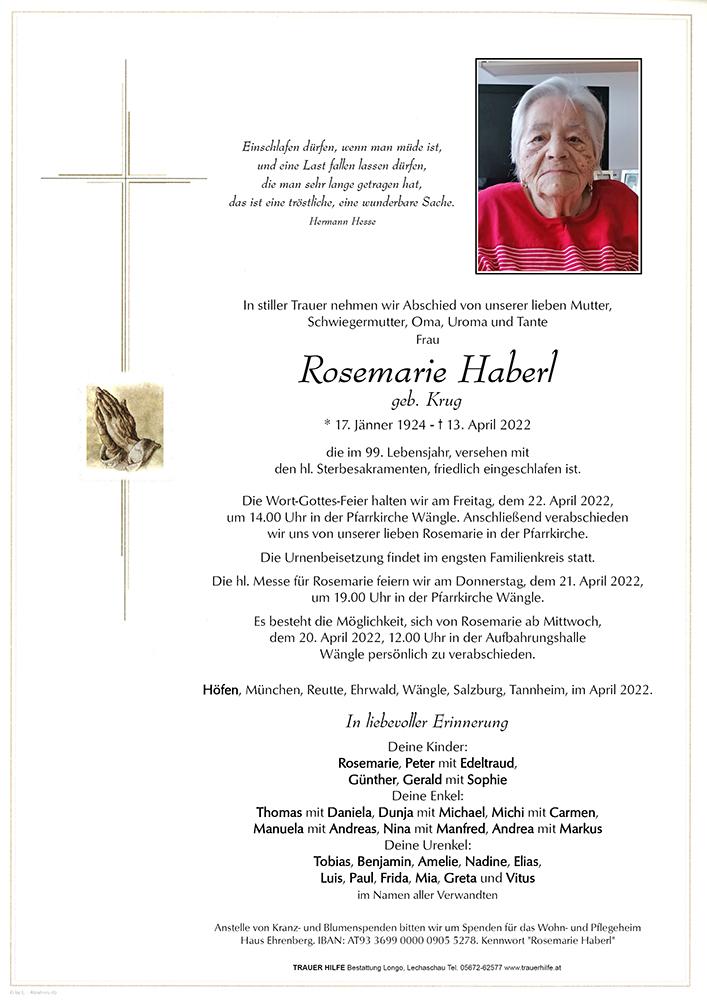 Mit dem Verlust eines geliebten Menschen verliert man sehr viel, aber niemals die schönen Erinnerungen an die gemeinsam verbrachte Zeit! In tiefer Trauer, aber gleichzeitig voller Dankbarkeit für alles Gute, sind wir verbunden über den Tod hinaus! In unseren Herzen tragen wir Frau Haberl weiter!