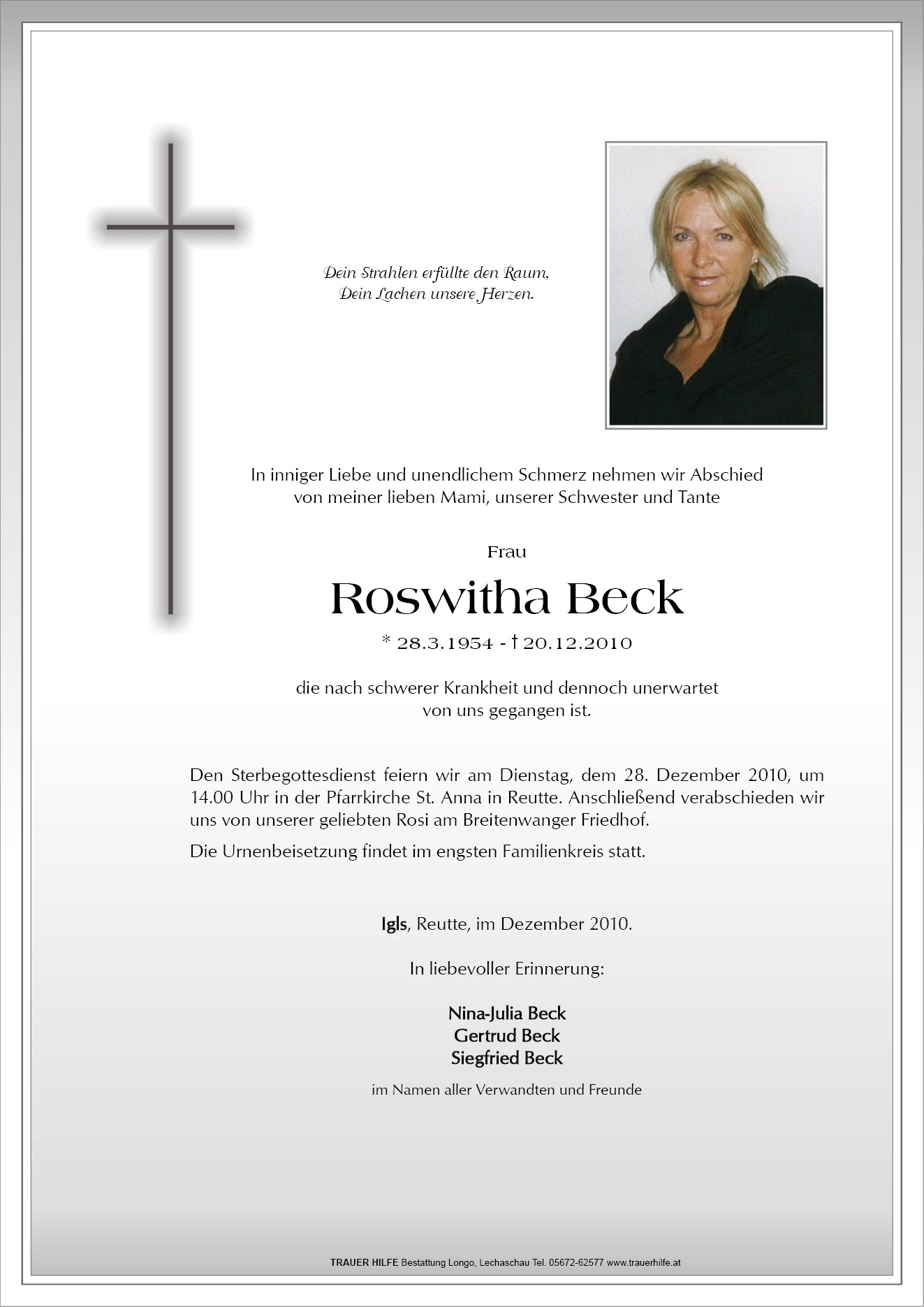 13.12.1901 20.12.2010 Igls Roswitha Beck Action Parte Sterbebild Gedenkkerzen Kondolenzen Parte Sterbebild Gedenkkerzen Kondolenzen Parte herunterladen Sterbebild herunterladen Gedenkkerzen für Roswitha Beck 0 Einträge Kerze anzünden Ihre Gedenkkerze fürRoswitha Beck Ihr Name* Farbe auswählen Ihre Nachricht oder Name* E-Mail-Adresse* Mit dem Klicken auf "Kerze anzünden" erklären Sie sich mit unseren Datenschutzbestimmungen einverstanden. Kondolenzbuch für Roswitha Beck 0 Einträge Kondolenz verfassen Ihr Abschiedsgruß an Roswitha Beck Ihr Name* E-Mail-Adresse* Ihre Nachricht* Mit dem Klicken auf "Gruß absenden" erklären Sie sich mit unseren Datenschutzbestimmungen einverstanden.