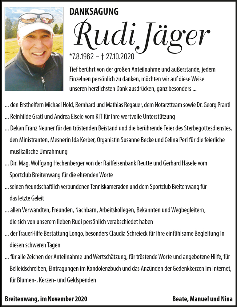 Rudi hinterlässt eine unendliche Leere, sein Platz bleibt für immer frei. Was überlebt sind die netten Erinnerungen an einen einmaligen Menschen: Ehemann, Papa, Sohn, Bruder, Schwager, Onkel, Sportler und Wegbegleiter. Mögen euch gute Gedanken helfen, die nächste nicht einfache Zeit des Begreifens und Loslassens zu erleben und anzunehmen – so, dass sie bald zur liebevollen Erinnerung werden. Mein aufrichtiges Beileid und stille Anteilnahme.