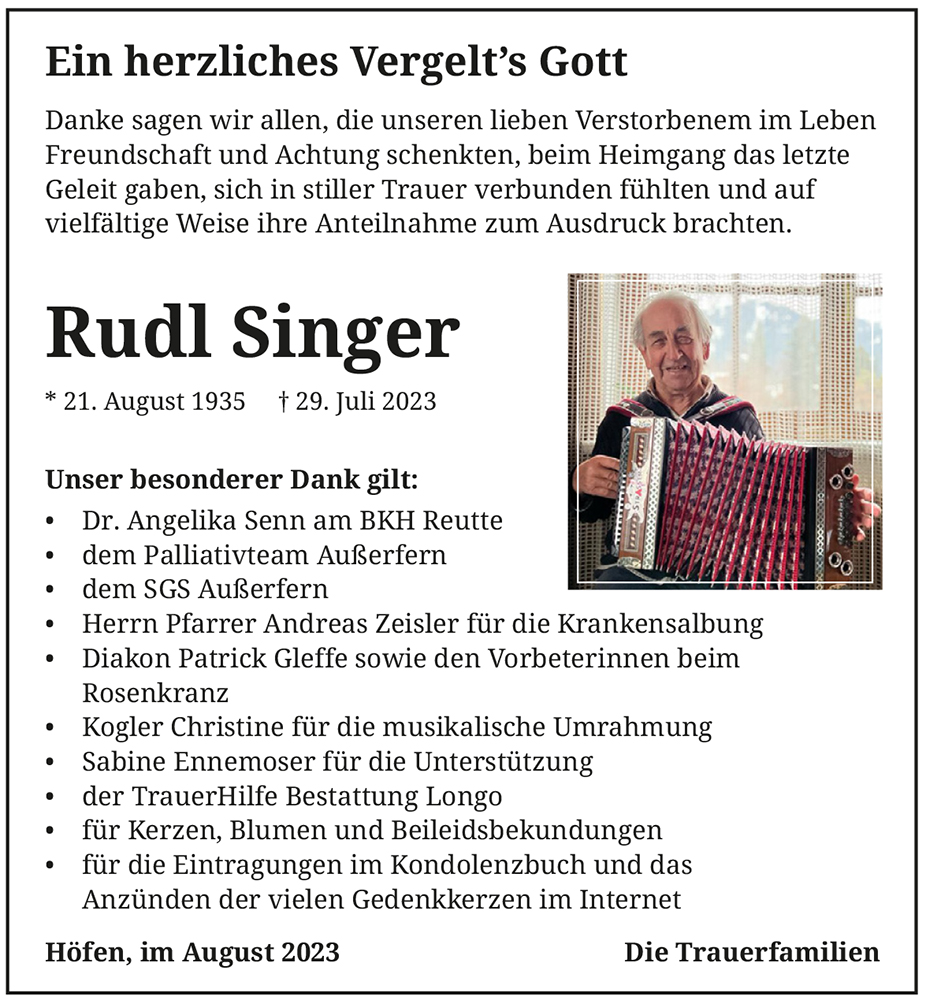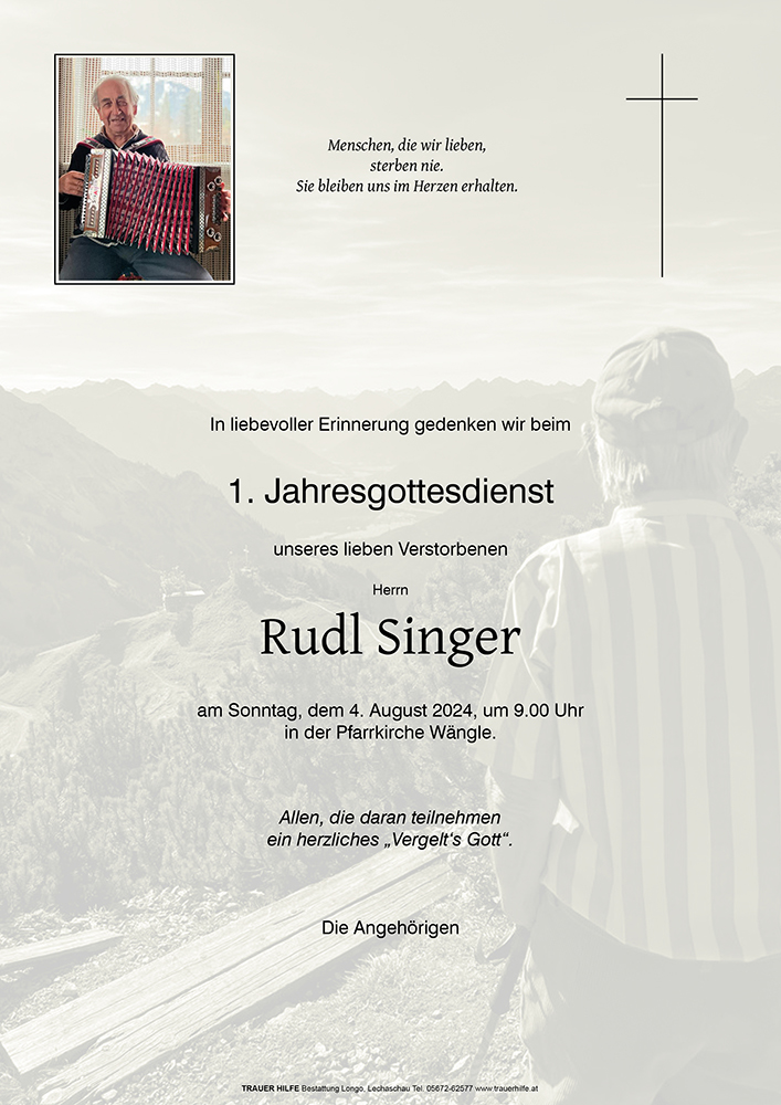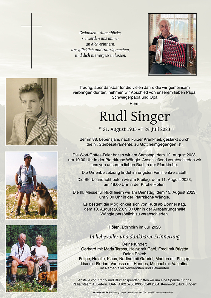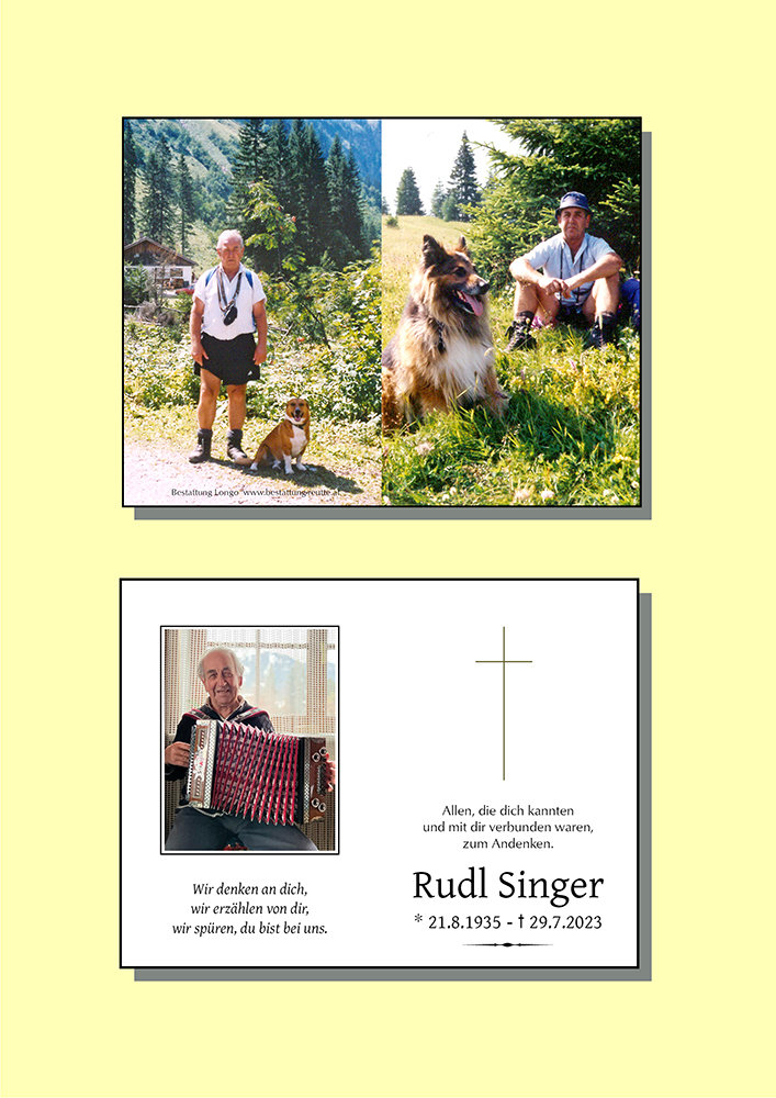 Trauert gemeinsam und erinnert euch an die schönsten Stunden in denen ihr mit Rudl zusammen ward, denn in euren Erinnerungen bleibt er für immer bei euch.