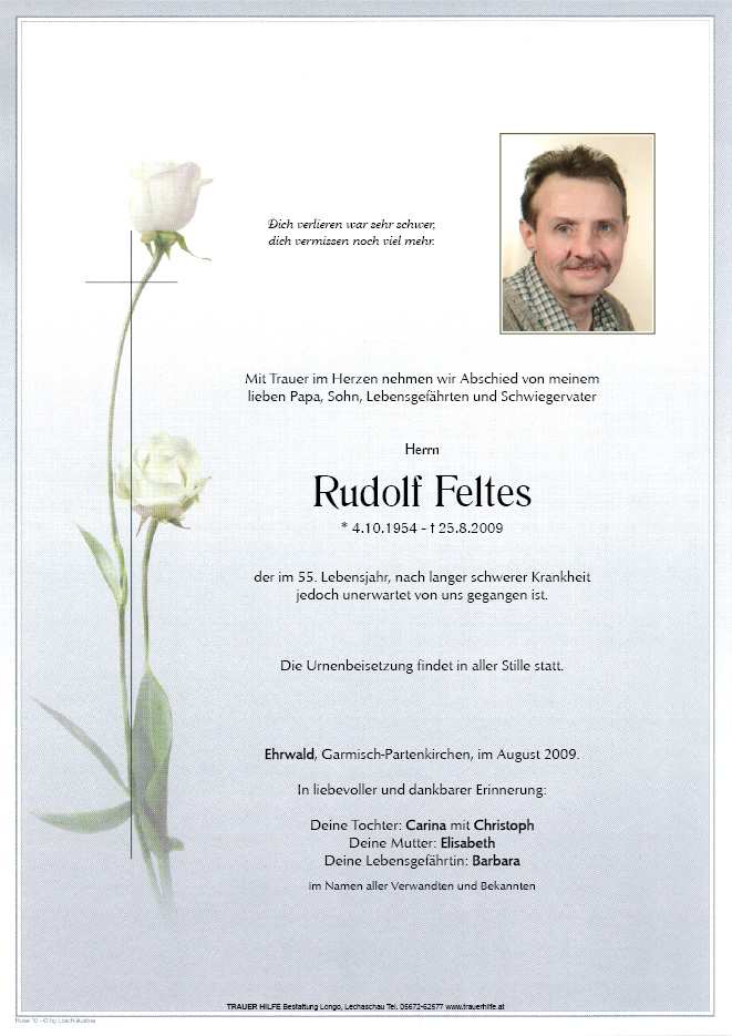 13.12.1901 25.08.2009 Ehrwald Rudolf Feltes Action Parte Gedenkkerzen Kondolenzen Parte Gedenkkerzen Kondolenzen Parte herunterladen Gedenkkerzen für Rudolf Feltes 10 Einträge Kerze anzünden unvergessen ❤️ Zum 16. Jahrestag ♥️?️ Alles Gute zum Vatertag ❤️ a Lichtle für di ❤️ Unvergessen in Liebe ❤️ a Weihnachtskerze für di ?? a Adventskerze ? In Liebe ❤️ Zum 70.Geburtstag ?❤️ 15 Jahre ohne dich in Liebe Barbara Ihre Gedenkkerze fürRudolf Feltes Ihr Name* Farbe auswählen Ihre Nachricht oder Name* E-Mail-Adresse* Mit dem Klicken auf "Kerze anzünden" erklären Sie sich mit unseren Datenschutzbestimmungen einverstanden. Kondolenzbuch für Rudolf Feltes 0 Einträge Kondolenz verfassen Ihr Abschiedsgruß an Rudolf Feltes Ihr Name* E-Mail-Adresse* Ihre Nachricht* Mit dem Klicken auf "Gruß absenden" erklären Sie sich mit unseren Datenschutzbestimmungen einverstanden.
