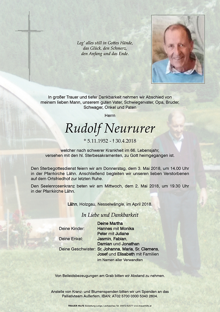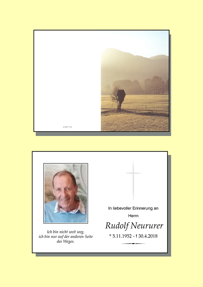 Ruhe aus von deinem Leiden lieber Rudi, bitter war für die Familie das scheiden, doch du zogst ja himmelwärts, Segnest täglich nun die Deinen die du hier so sehr geliebt, bis wir fröhlich uns vereinen ,dort wo es keinen Tod mehr gibt .
