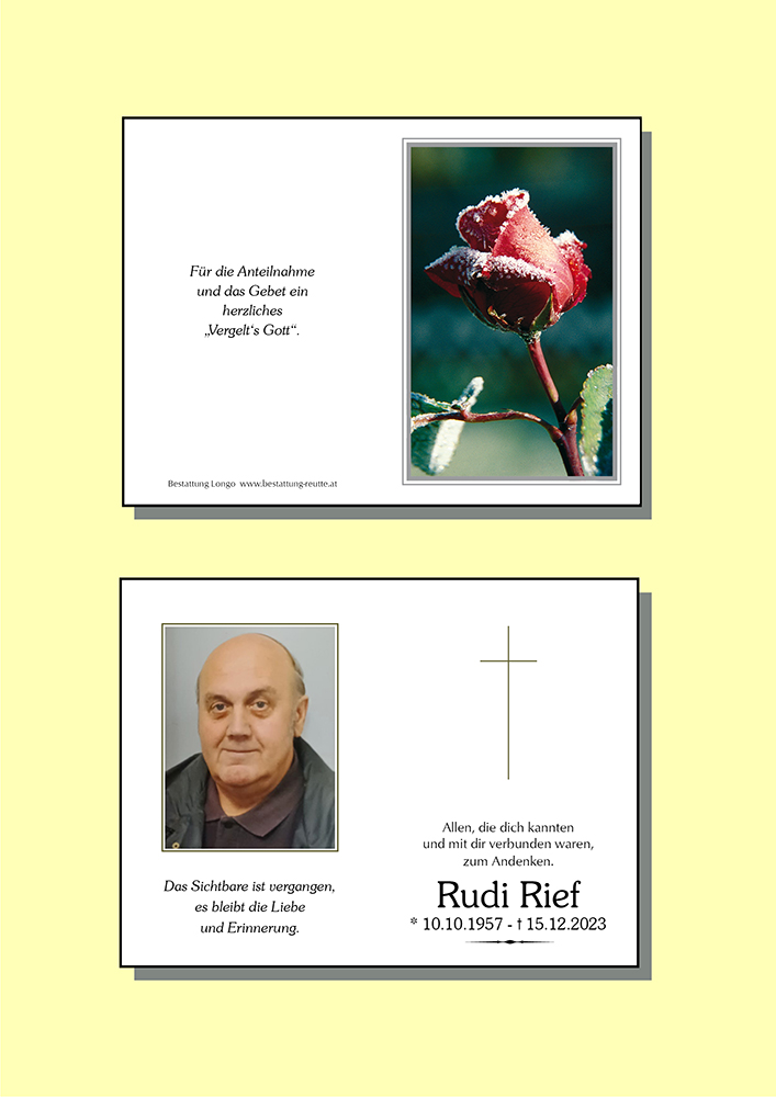 Es klingelt nicht mehr,es sagt auch niemand Tante wie geht\'s dir, eine Stimme schweigt die mir vertraut war, so manches erzählt und anvertraut hat.Manchmal fragte wo warst du?,wenn ich nicht so schnell am Telefon, warst du Wallfahrten? Nun lieber Rudi hast du die Wallfahrt angetreten in Gottes Reich zu DeinenLieben . Beschützte und schaue von oben auf deine Mama deinen Sohn und Frau sowie deine beiden Enkel. Ein letztes Pfiati und Ruhe in Frieden ?️??
