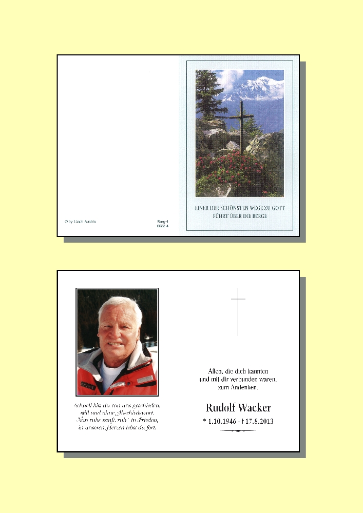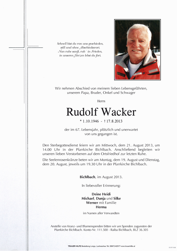 Tief erschüttert haben wir die Nachricht durch euren Freund heute erhalten. Wir sind in Gedanken bei Euch und werden euren lieben "Rudi" in unserem Nachgebet einschließen. Wir wünschen Euch - liebe Heidi, lieber Michael, liebe Dunja, liebe Silke - viel Kraft. Er wird ewig in unserer Erinnerung sein. Es denkt an Euch Familie Pfeifer/Familie Schallhart Marion