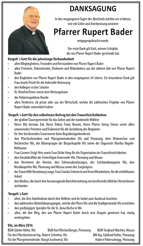 Es ist mir ein Bedürfnis, der Stadt Vils meine "Mittrauer" auszudrücken.