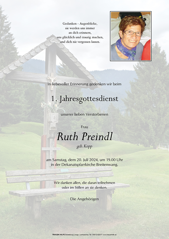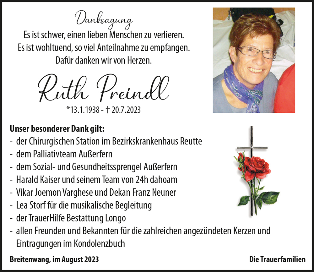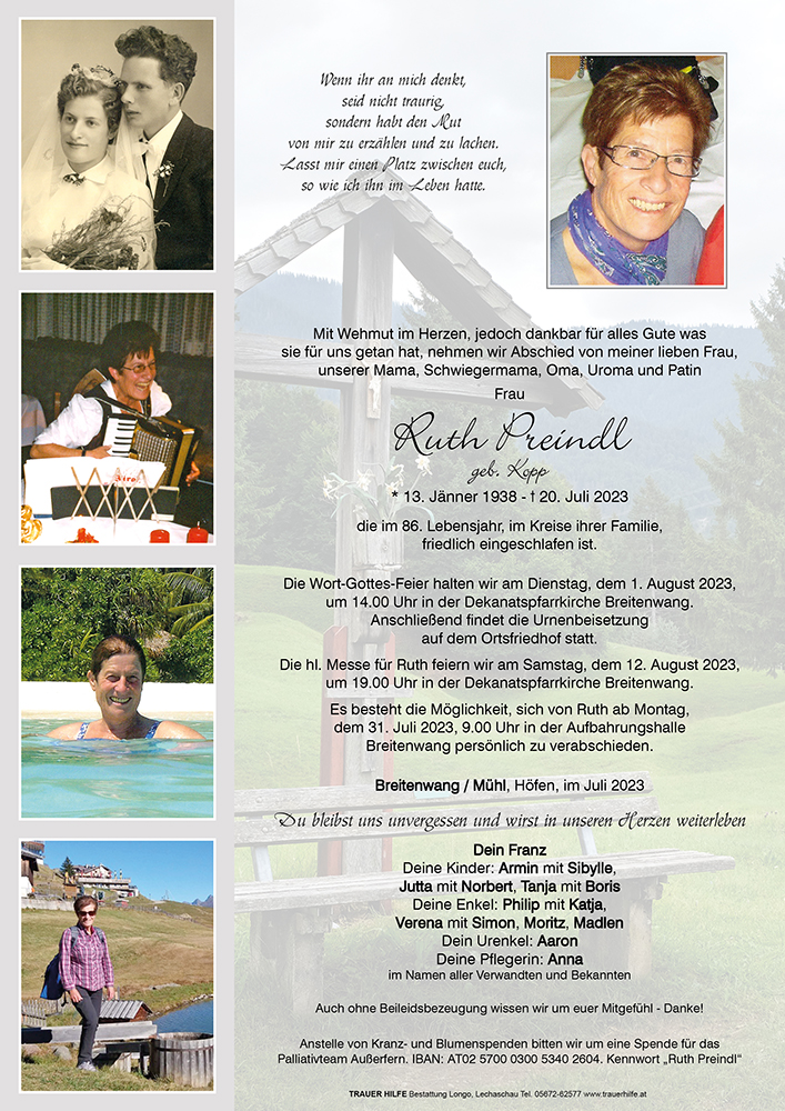 Mit Bestürzung haben wir vom Tod von Ruth erfahren. Ruth war ein langjähriges Mitglied des Pensionistenverbandes Österreich und auch der Ortsgruppe Weissenbach. Mit ihrem fröhlichen Wesen, ihrer Freundlichkeit, ihrer Freude an Musik und Gesang war sie bei unseren Aktivitäten immer ein gern gesehener Gast.
