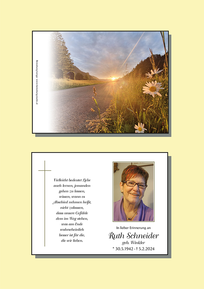 Worte können den großen Schmerz und die tiefe Trauer wohl nicht ausdrücken, wenn so ein herzlicher Mensch wie Tante Ruht es war, von uns geht. Ich möchte Euch zum Verlust Eurer lieben Mama und Oma, von ganzem Herzen, mein aufrichtiges Beileid aussprechen. Der gewählte Spruch auf der Parte, beschreibt auch ein wenig meine Empfindung. Die schönen Augenblicke mit Ruth, bleiben mir ebenso gegenwärtig. Auch wenn Sie nicht mehr da ist, in meiner Erinnerung bleibt Sie und geht nicht. Liebe Martina, liebe Trauerfamilie, ich wünsche Euch viel Kraft, um diese schwere Zeit durchzustehen. Cousin Manfred, Innsbruck