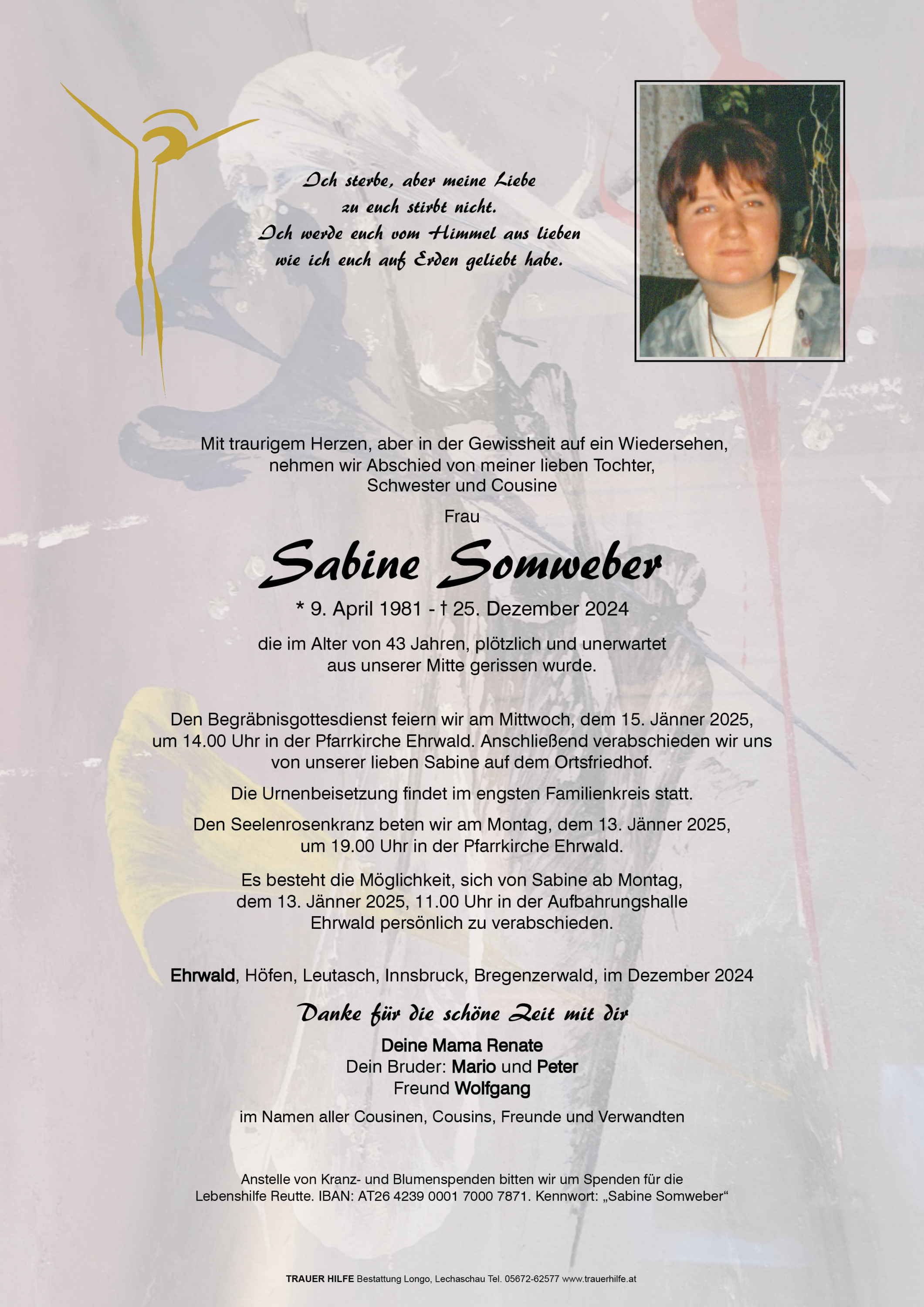 Wir möchten euch unser aufrichtiges Beileid zum Tod von Sabine aussprechen,