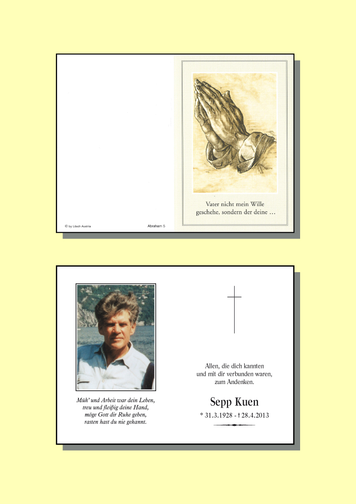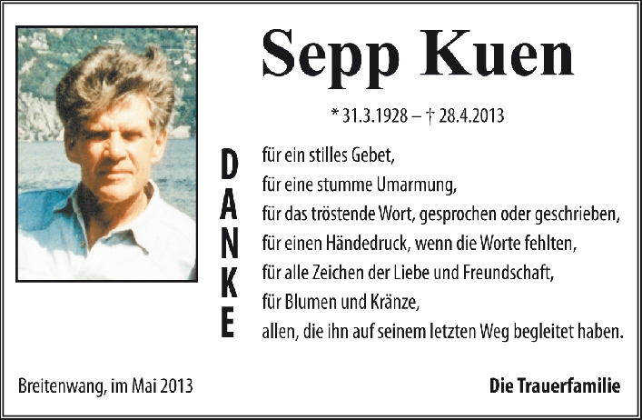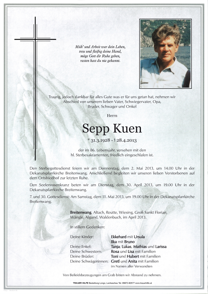 Als lieben und angenehmen Menschen haben wir Sepp, euren Vater gekannt. Viele nette Gespräche in unserem Geschäft haben uns verbunden. Seine ruhige und bescheidene Art haben wir sehr geschätzt. Wir möchten euch liebe Ilka und Ekkehard unser aufrichtiges Beileid aussprechen.