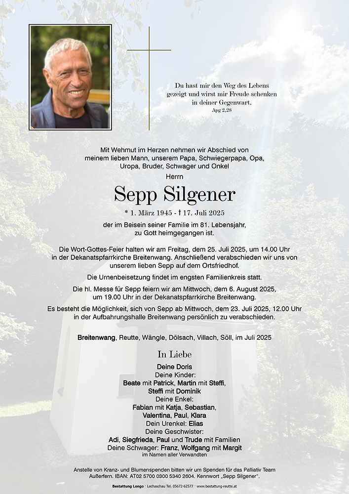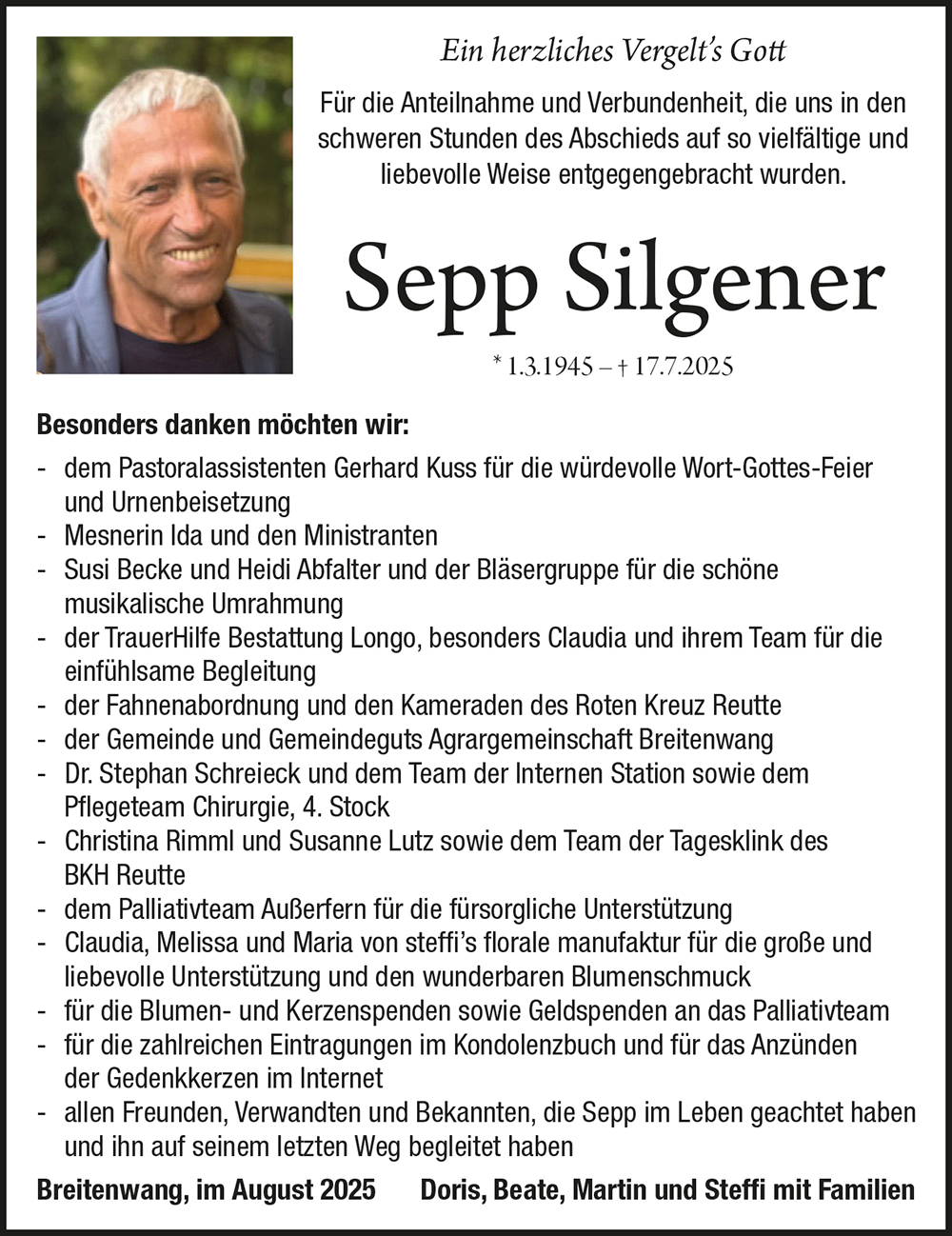 Der Herrgott möge Eurem lieben Sepp all das Gute, was er Euch und seinen Mitmenschen getan hat, reichlich lohnen. Lieber Sepp ruhe in Frieden.