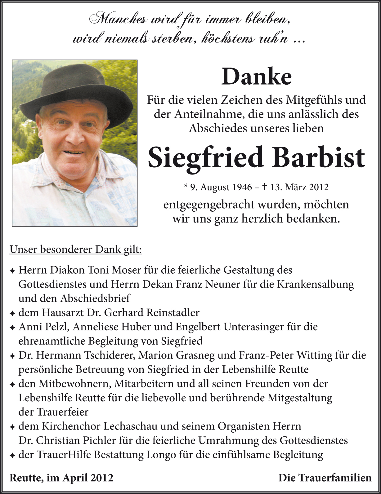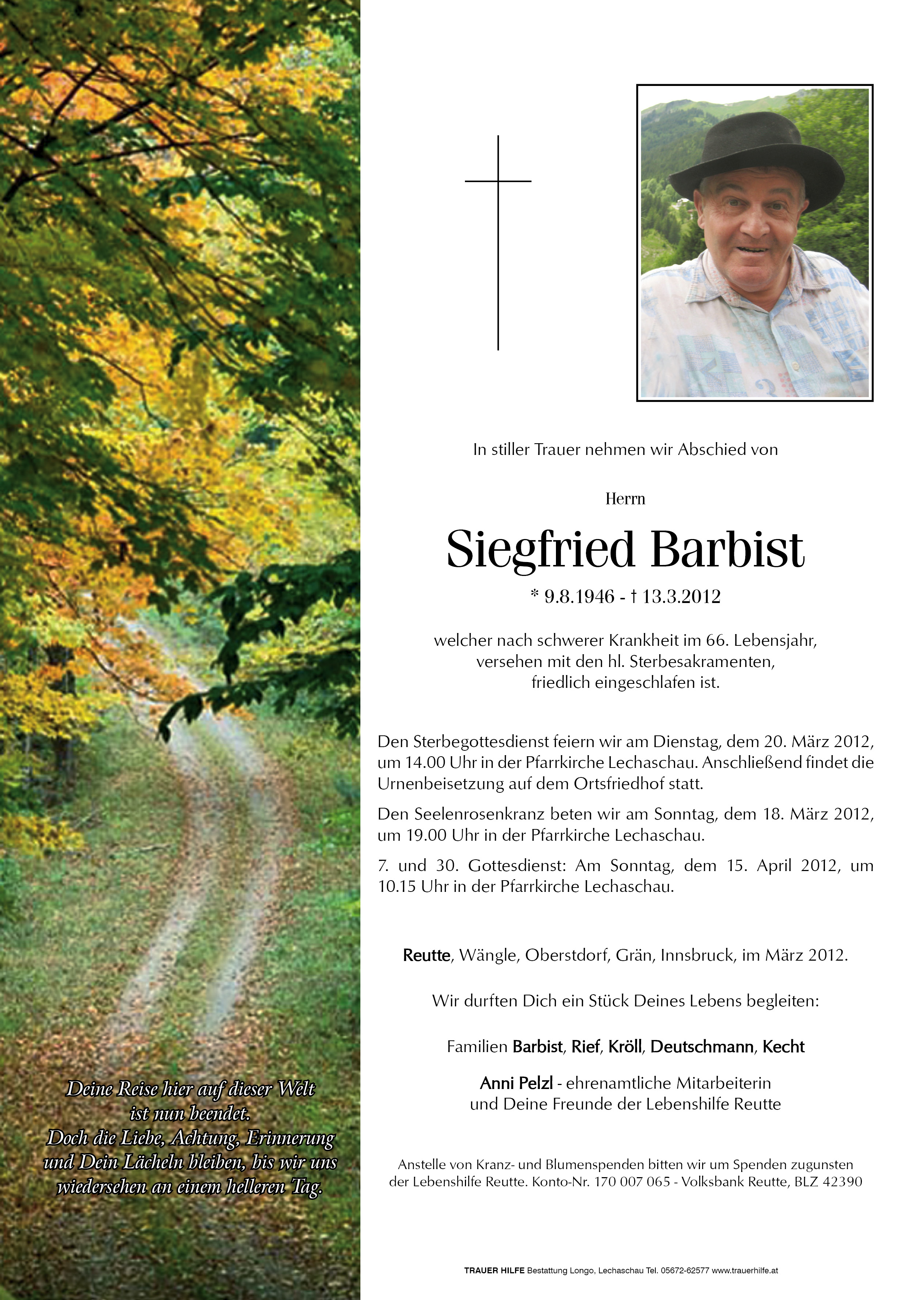Lieber Siegfried, wir kennen uns schon sehr lange, sind ungefähr gleich alt.Oft bist du mit deiner Mutter nach Reutte gegangen, da seid ihr an unserem Haus vorbeigekommen und wir haben immer wieder mal ein paar Worte gewechselt.Du hattest es nicht immer einfach im Leben, musstest manchen Spott und Hohn ertragen. Nach dem Tode deiner lieben Mama hast du in der Lebenshilfe eine neue Heimat und Freunde gefunden. Am Ende deines Weges hat sich noch dein großer Wunsch erfüllt, der liebe Gott hat dich " adoptiert ", indem er dich zu sich gerufen hat. Ruhe in Frieden! B.I.