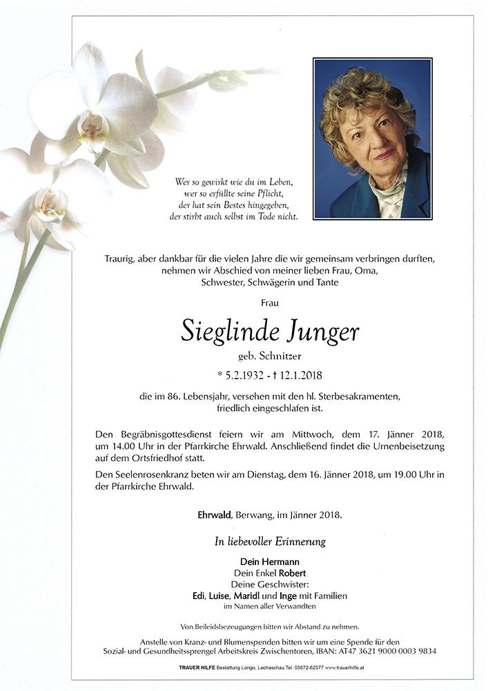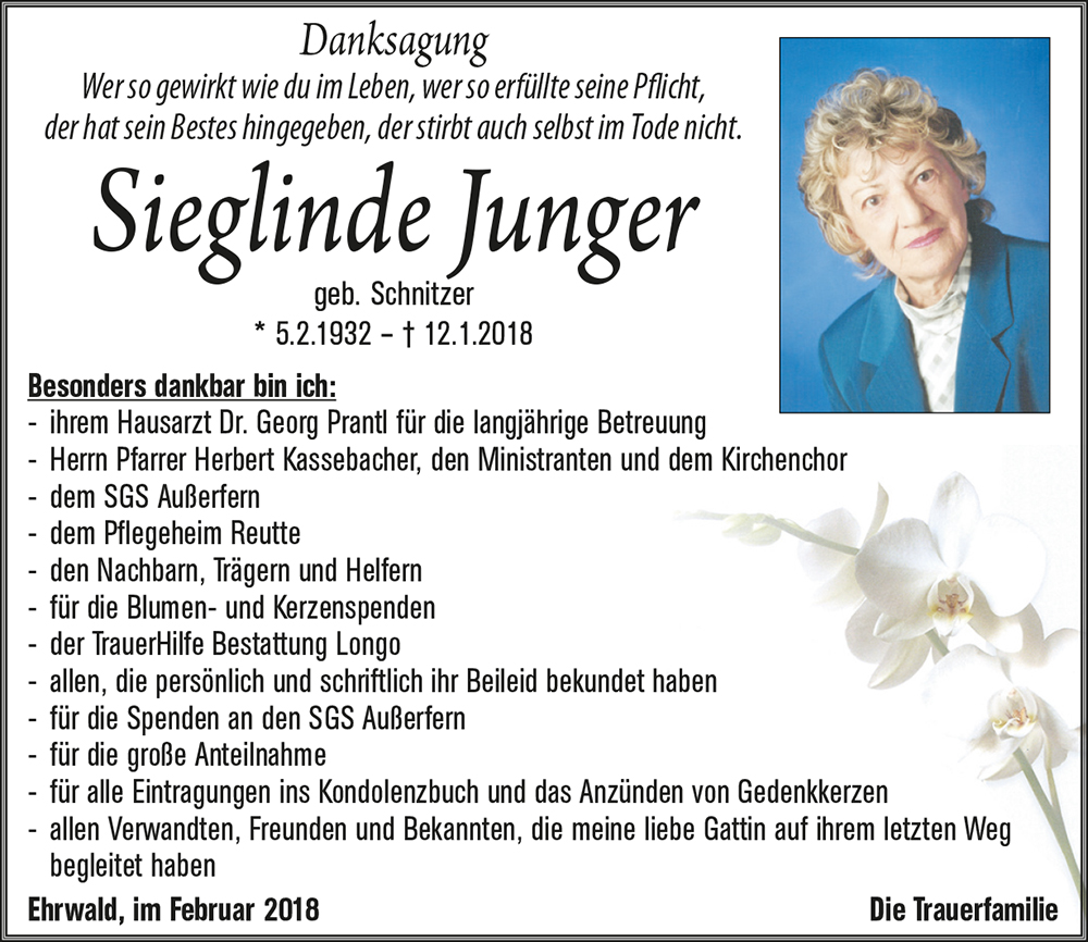 Zum Tode deiner Frau Sieglinde möchte ich dir meine aufrichtige Anteilnahme aussprechen und dir viel Kraft in der Zeit der Trauer wünschen. Deine aufopfernde Fürsorge in der Zeit ihrer doch schon längeren Krankheit war beispielgebend und soll dir Trost im Verlust sein.